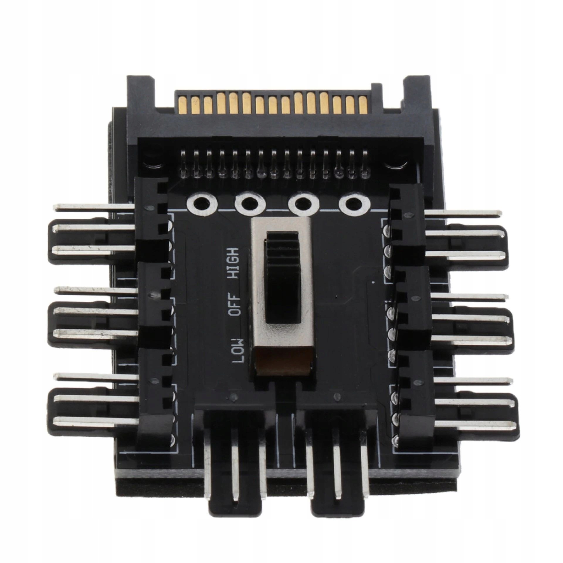 . У колекторі є 8 3 -контактних роз'ємів дозволяє підключити 8 вентиляторів, завантажену з порту SATA. Кнопка OFF / LOW / HIGH для ручного управління швидкістю вентилятора. Світлодіодна сигналізація Адаптерна робота. З нижньої частини адаптера є 3 -метрова клейка стрічка, яка забезпечує кріплення в будь -якому місці.