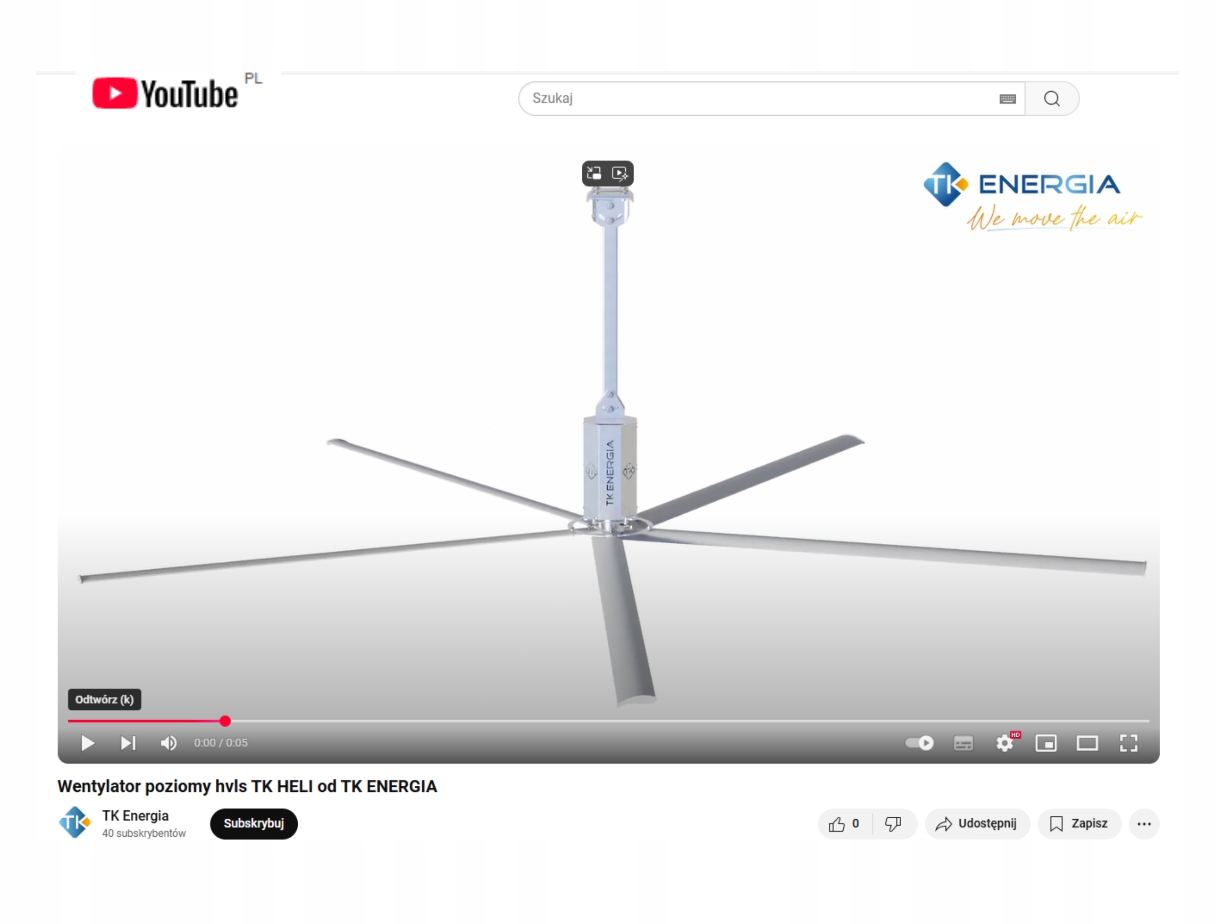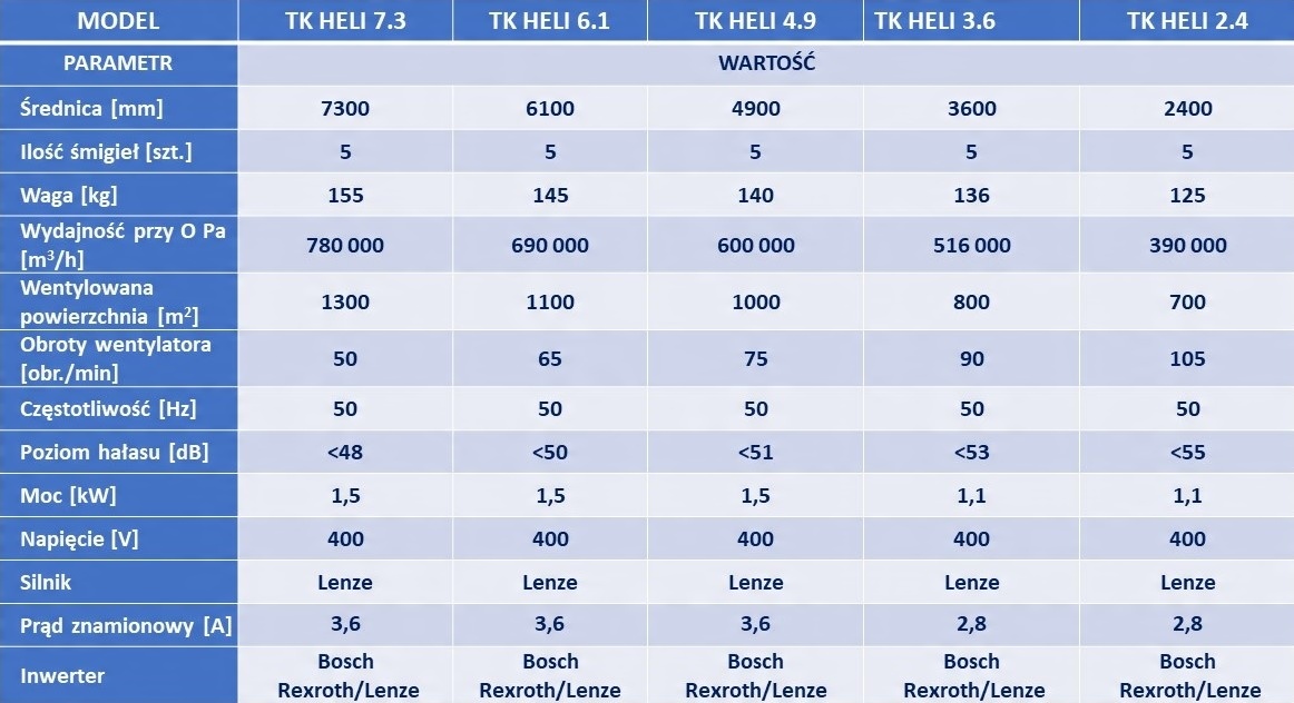шанувальники HVLS TK Heli були розроблені для вентиляції споруд з великим обсягом. HVLS, тобто низька об'ємна низька швидкість, означає високі показники з низькою швидкістю. TK Heli вентилятор - це пристрій з найвищими показниками, порівняно з споживанням електроенергії. Робота вентилятора заснована на обертовому русі низької швидкості та низькому споживанні електроенергії. Лопатки вентилятора викликають повітря вниз і змішують його по всьому обсягу, завдяки якому вони забезпечують ідеальний мікроклімат у закладі. вентилятори TK Heli виробляються в Польщі, використовуючи найвищої якості матеріалів . Переміщення гвинтів з ультра алюмінію, компоненти авторитетних виробників (Lenze, Nord, Bosch, Danfoss). Це гарантує неприємності -безперебійні роботи протягом багатьох років.