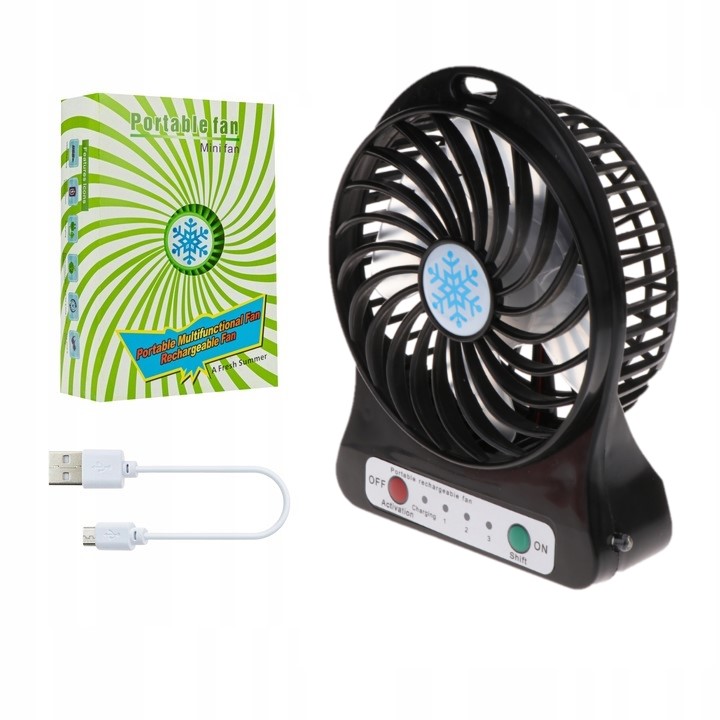 Вентилятор заряджається за допомогою кабелю microUSB, його можна підключити до блоку живлення, комп'ютера, ноутбука або павербанка. Крім того, він має змінний акумулятор типу 18650, який накопичує енергію після зарядки і дозволяє використовувати пристрій без підключення до джерела живлення. Вентилятор має 3-ступеневе регулювання потоку повітря, зарядний діод і маленький білий світлодіод, який можна використовувати як ліхтарик. У верхній частині вентилятора є отвір, щоб його можна було повісити.