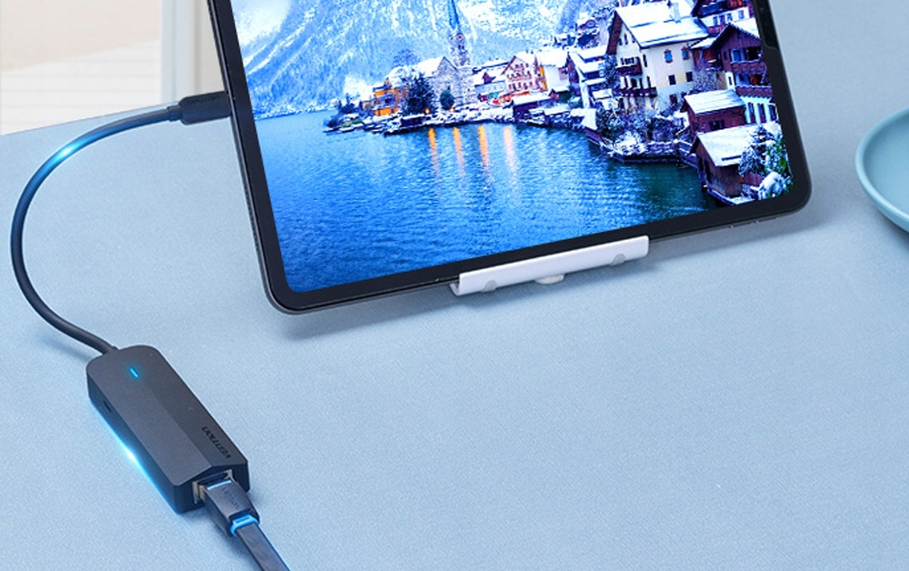 - USB-концентратор Vention містить три порти USB 2.0, один порт Micro USB і порт RJ45