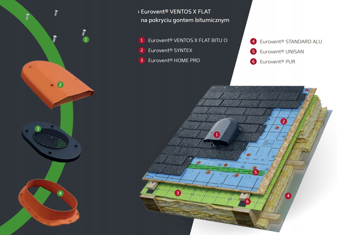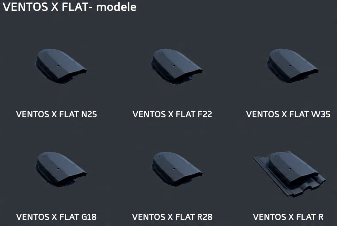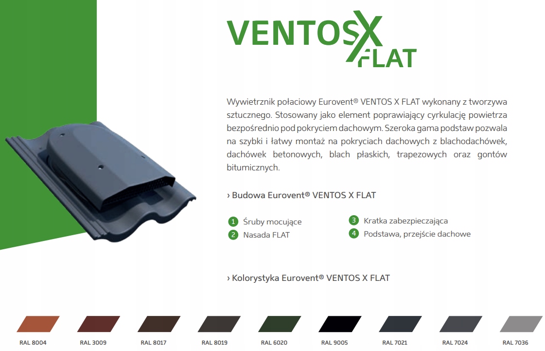 Вентилятор Eurovent® VENTOS X FLAT з пластику. Профільована основа перешкоджає надходженню дощової води. Має основу для кріплення каміна на металочерепицю з різними тисненнями. Доступний у кількох найпопулярніших колірних варіантах відповідно до: кольорів RAL.