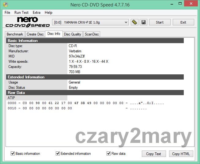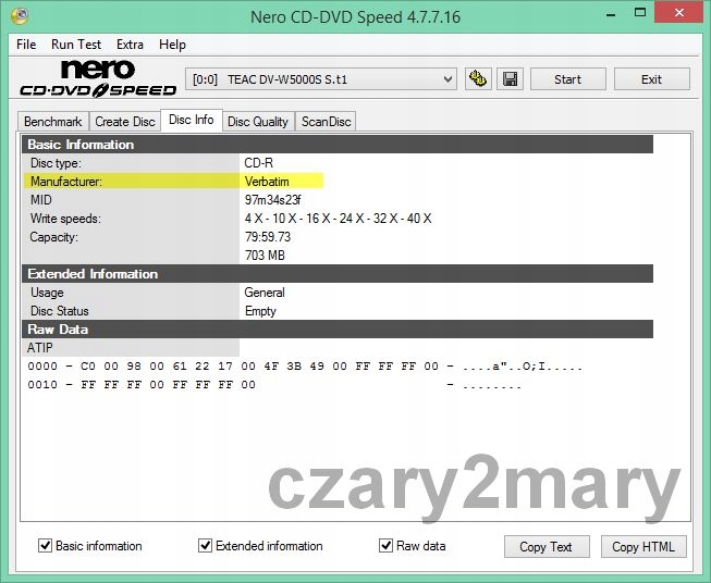 Логотип виробника Verbatim - Пресовий завод Mitshubishi Kagaku Media -ATIPMID: 97m34s23f (ідентифікатор виробника) - клас якості A+