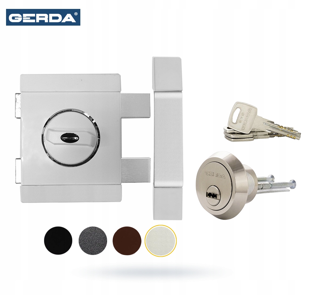 Універсальний, простий в установці замок Gerda з найвищою стійкістю до злому. Має сертифікат класу 7. Оснащений двома масивними болтами і дуже міцним корпусом. Виробник використав у замку загартовану пластину, яка запобігає його висвердлюванню навіть самими загартованими свердлами.