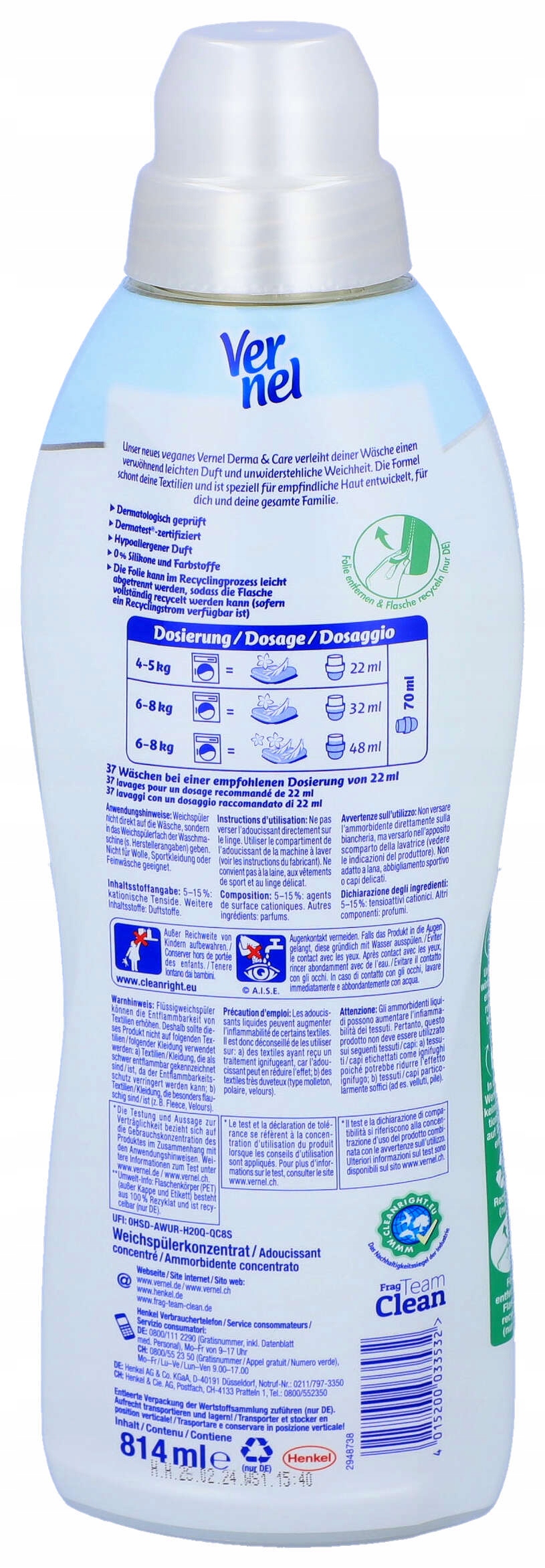 Вернельна тканина змивання рідини особливо делікатна для шкіри та текстилю. Завдяки унікальній формулі догляду, вона запобігає електрифікації, полегшує прасування та захищає волокна. Крім того, консистенція є веганською і памперує легкий, чутливий до шкіри запах.