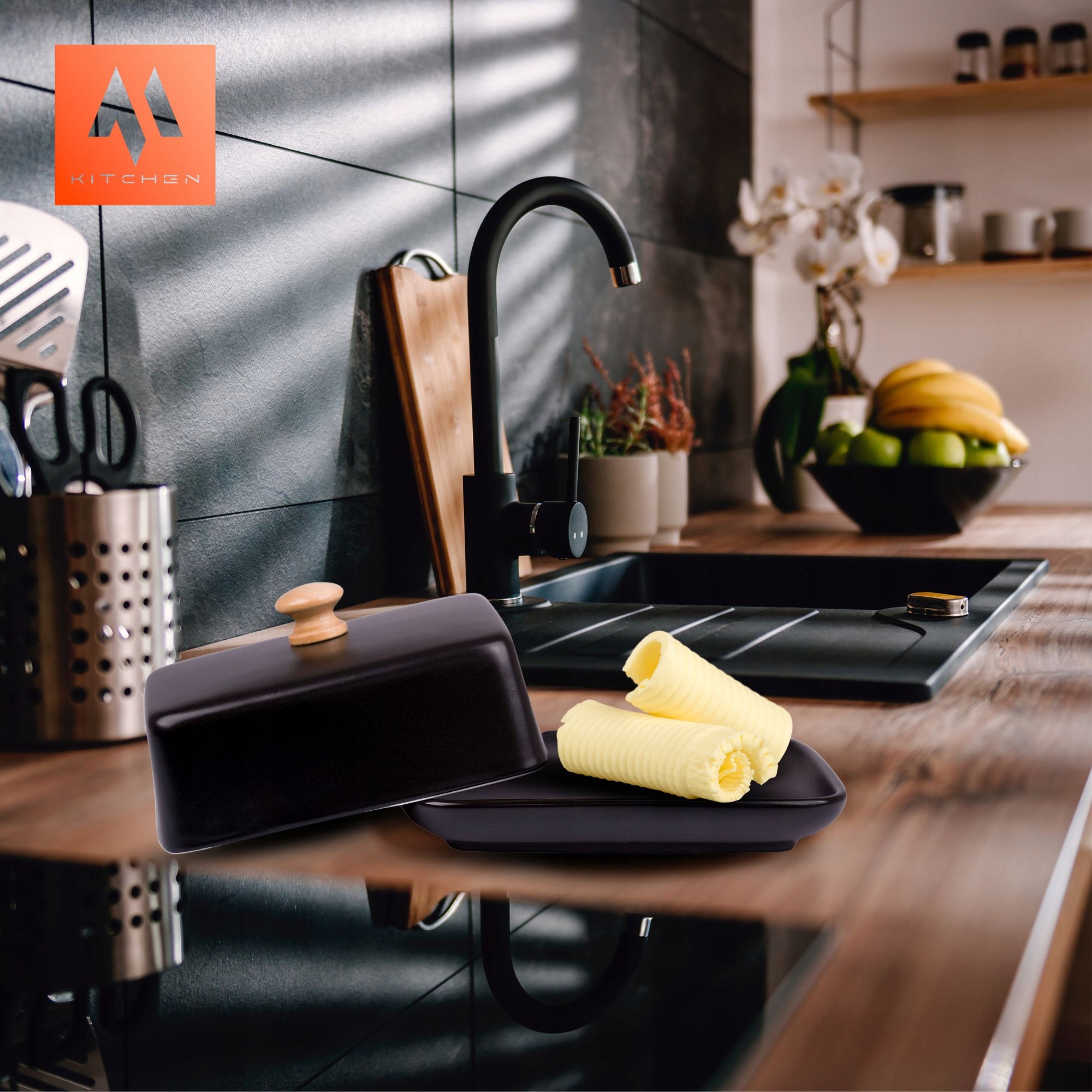 Набір вершкового масла та кондитерського огаго - відмінна пара, яка ідеально вміститься в кожен стіл, вводячи витонченість та функціональність. Обидві страви, виготовлені з високоякісної кераміки в класичному чорному з бамбуковими кришками, - це унікальний декоративний та практичний елемент на кухні. Завдяки цьому наборі ваш сніданок або чай отримає нового, стильного персонажа.