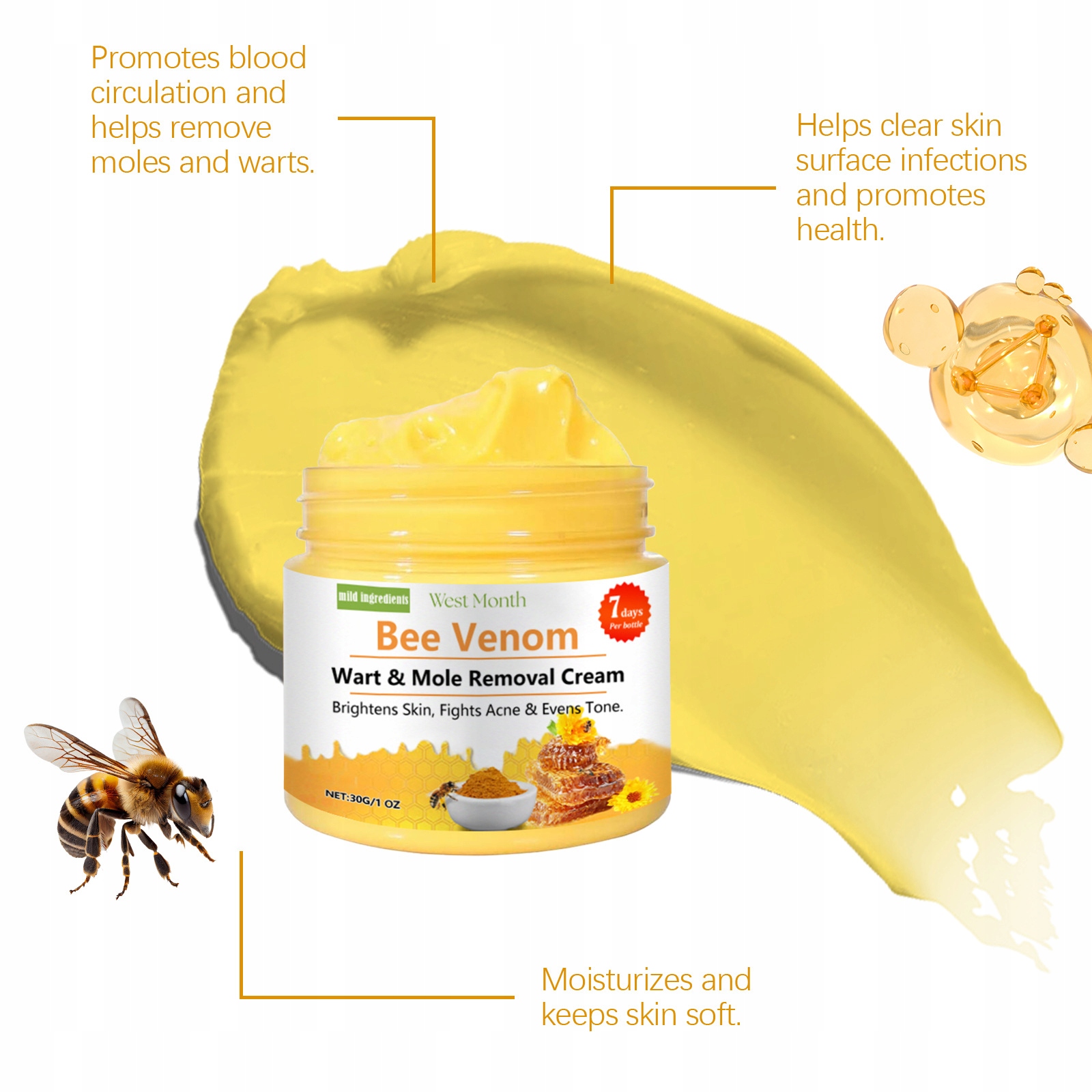 1. Інноваційна формула: Бджолина отрута використовується як основний інгредієнт, який може ефективно інгібувати WARTS росту та відтворення та відігравати роль пристрою у видаленні Warts та Skin.