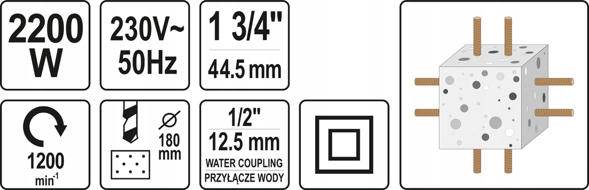 Універсальне алмазне свердло для роботи зі штативом або ручне. Бурова установка має потужність 2200 Вт і працює на швидкості 0-1200 об / хв. Дозволяє свердлити отвори в дуже широкому діапазоні від 30 мм до 180 мм.
