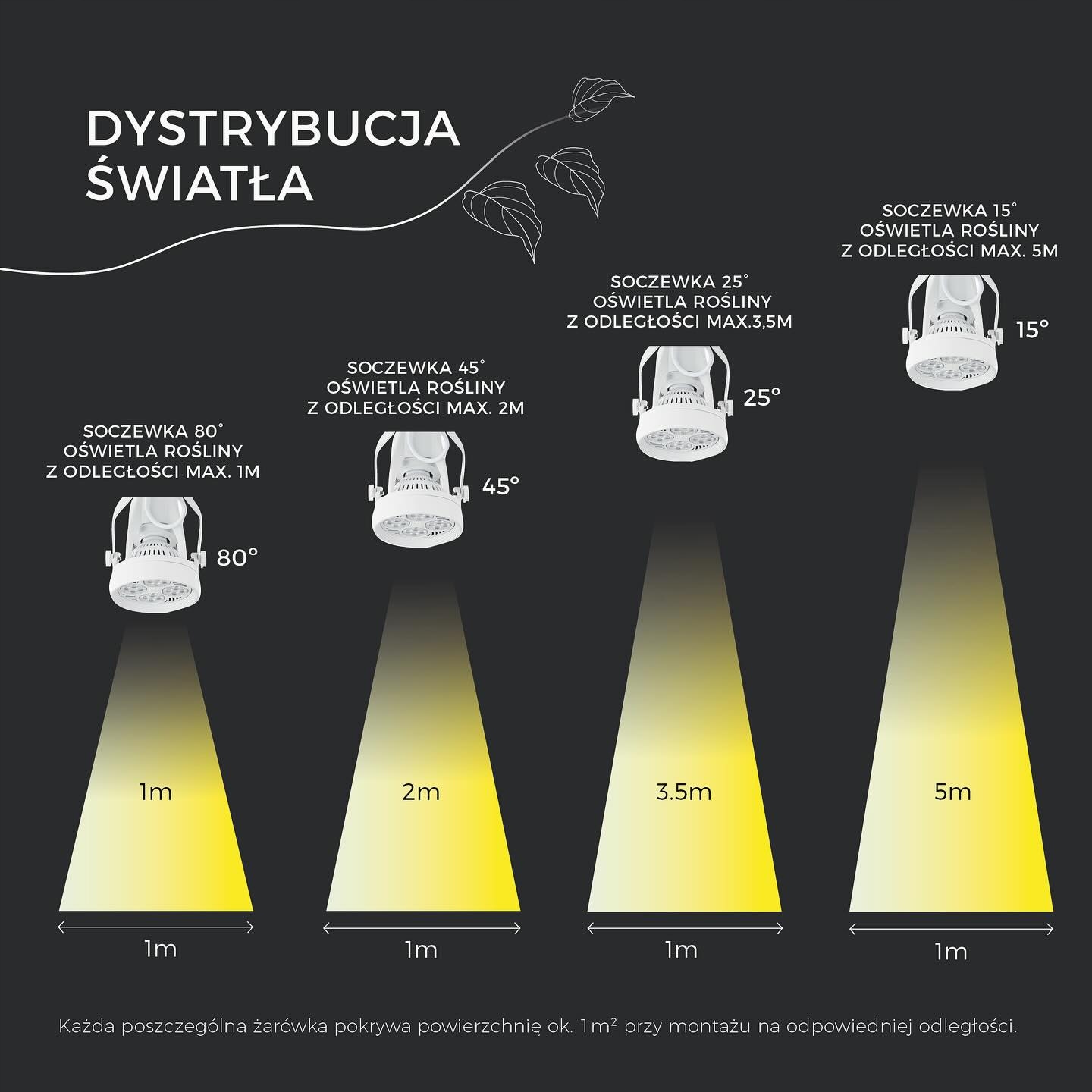 Лампи VERTICANA є ідеальне рішення для всіх, хто хоче освітлити свої рослини. Спеціально розроблений світлий колір дозволяє рослинам швидше рости та повністю розкривати свій генетичний потенціал. Світло, яке виробляють наші лампочки, сприймається людським оком як близьке до білого, на відміну від конкуруючих рішень, які характеризуються неприємним, дуже червоно-синім світлом. Кожна лампочка в нашій пропозиції освітлює 1 м². Виберіть відповідну лінзу відповідно до відстані, з якої ви будете освітлювати свої рослини.