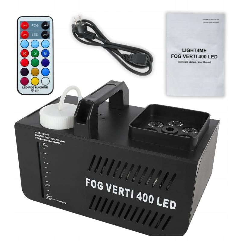 LIGHT4ME FOG VERTI 400 LED оснащений бездротовим інфрачервоним пультом дистанційного керування, який дозволяє дистанційно керувати пристроєм. Завдяки цьому ви можете повністю контролювати дим і світлові ефекти, не звертаючись до генератора. Крім того, зручна ручка для перенесення дозволяє легко транспортувати та розміщувати пристрій у будь-якому місці. Це особливо важливодля людей, які часто змінюють місце проведення подій, наприклад мобільних ді-джеїв або аніматорів ✅.