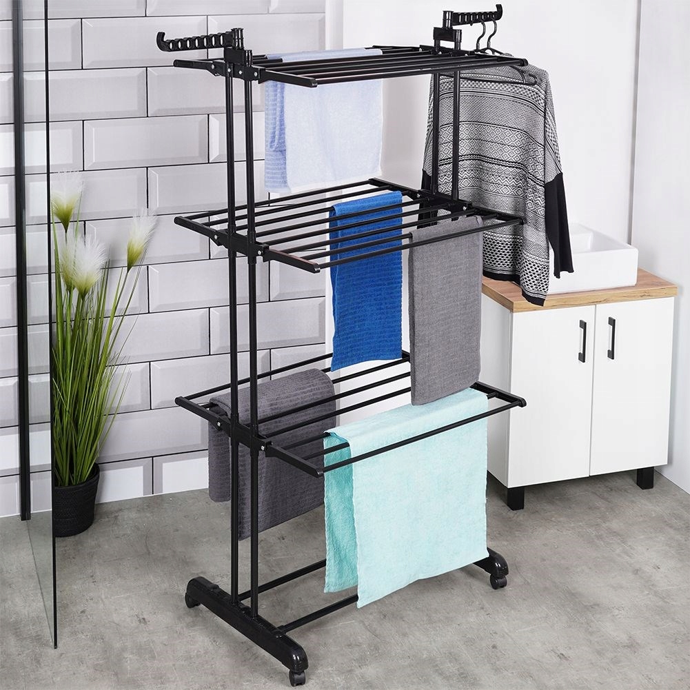 Трьохрівнева вертикальна сушарка для білизни. Сушарка виконана з міцних матеріалів і представлена в модному чорному кольорі. Має шість складних кронштейнів, які ідеально підходять для розвішування невеликої або великої кількості білизни. Додаткові тримачі для вішалок і поличка полегшать розташування одягу та взуття під час сушіння. Завдяки функції складання сушарка в складеному вигляді не займає багато місця. Необхідно мати в кожному домі. При правильному використанні він прослужить багато років. Оригінальний продукт Vilde. Виготовлено відповідно до європейських стандартів.