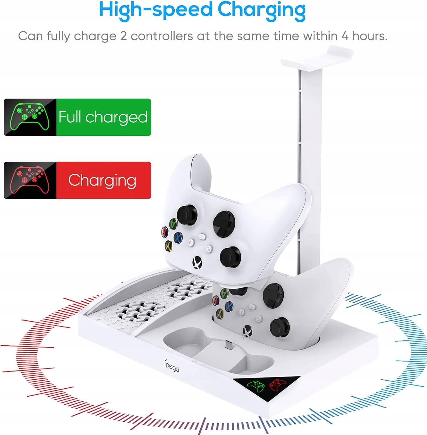 - Охолодження та тримач для навушників: підставка для заряджання має два вбудовані високошвидкісні вентилятори, які відводять тепло від консолі та запобігають її перегріванню. Ви можете поставити ігрову гарнітуру на підставку. Одна багатофункціональна зарядна станція, яка допоможе вам підтримувати порядок на своєму столі