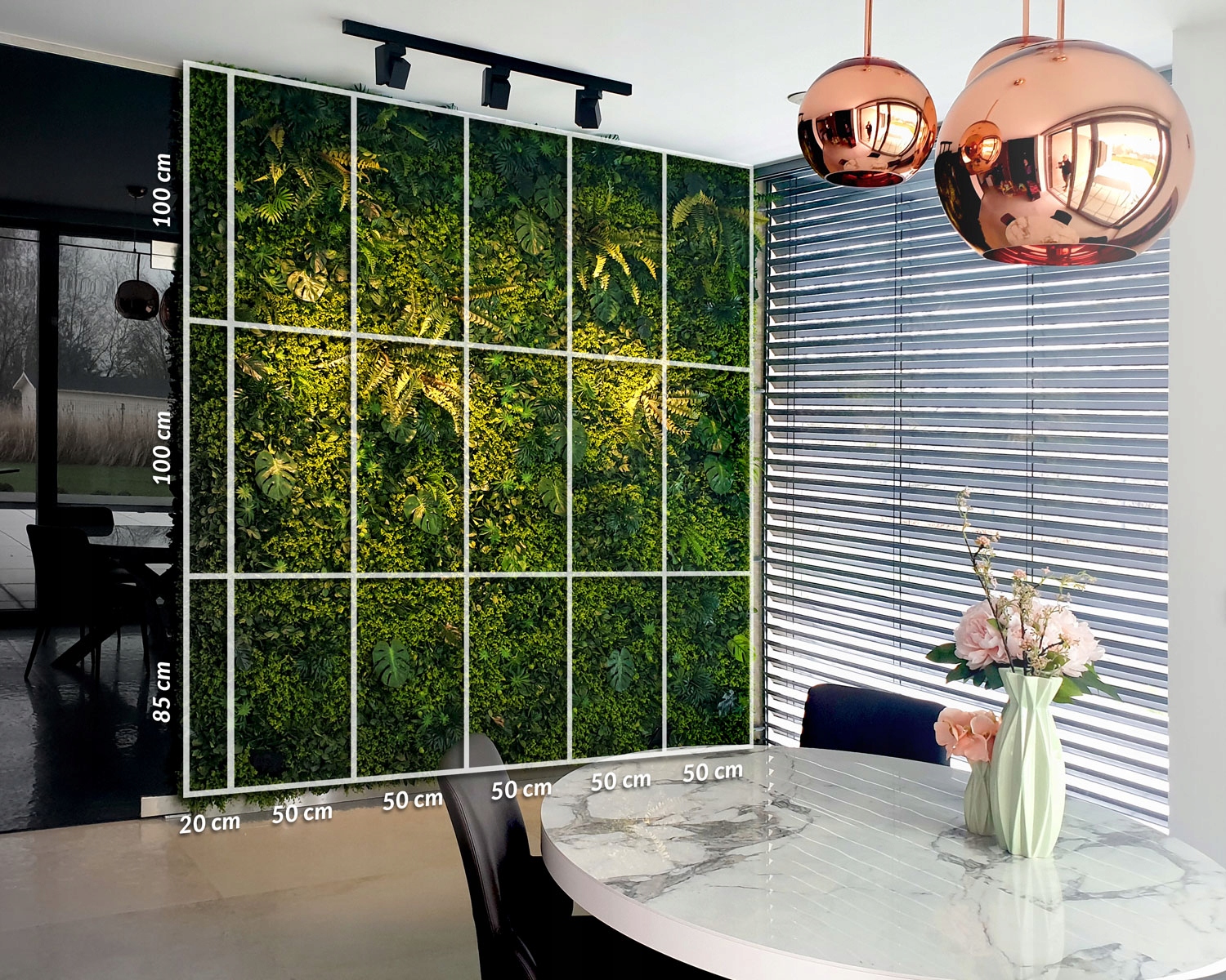 1. Створюється схема поділу стіни на модулі. Окремі частини пронумеровані. Таким чином ви точно знаєте, де монтувати кожен елемент, щоб отримати цілісну композицію штучних рослин.