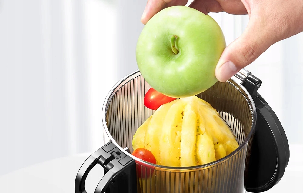 amzchef SJ-036-GA соковижималка повільно-це чудовий вибір для любителів свіжих природних соок. Завдяки великому отвору діаметром 135 мм, вам не потрібно розрізати інгредієнти на невеликі шматочки, що економить час і забезпечує чистоту на кухні. Двигун високої якості 250 В. дозволяє точне та ефективне видавлення соку, мінімізуючи окислення, а також гарантує виняткову довговічність і потужність равлика, що дозволяє максимально витягувати сік.