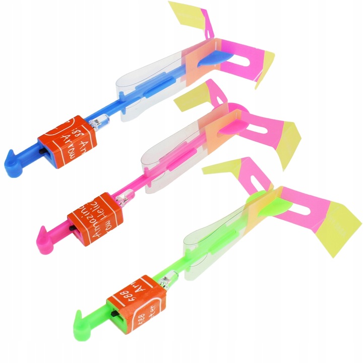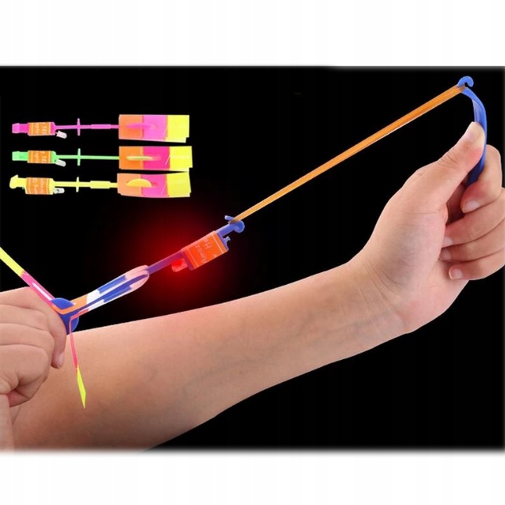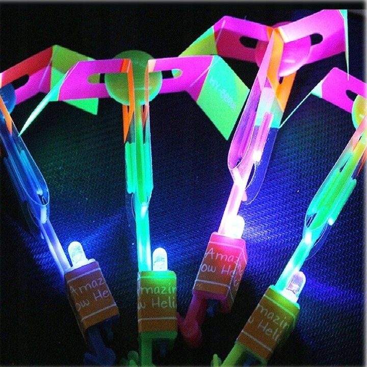 Світлодіодний вітряк (вертоліт) із пусковою установкою. Після пострілу вгору , перетворюється як рогатка в стрілу, що летить на кілька метрів угору. Він опускається яквертоліт завдяки складному гвинту - він повільно падає на землю. Дивовижні світлові ефекти в простій іграшці!