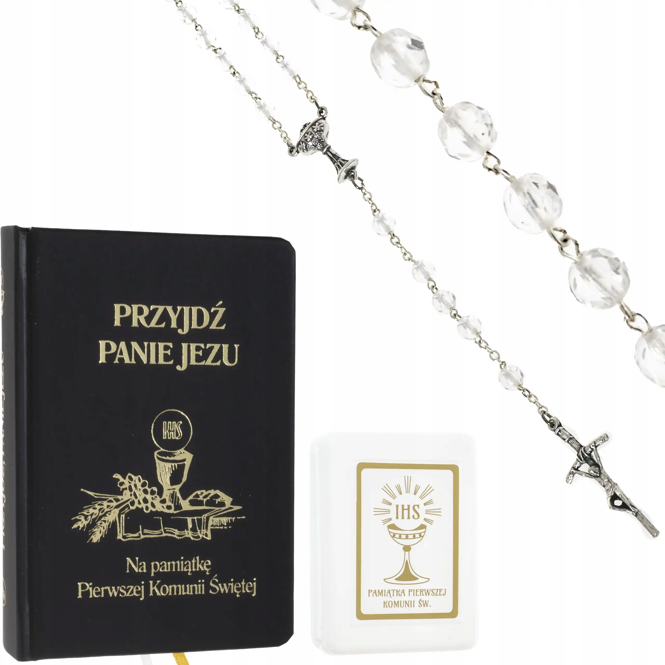 Набір для причастя: книга для першого причастя чорного кольору + вервиця для причастя, прозорий кристал з білою ниткою + футляр для розарію із зображенням чаші для першого причастя, білий