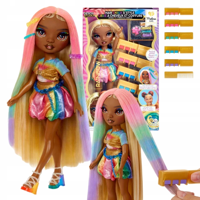 Meline Luxe - це золота красуня, яка довге блискуче волосся - ідеальне полотно для творчих розваг. Її стилізація веселки з блискучими деталями підкреслює її унікальний характер, а модне взуття на платформі додайте трохи примхливості.