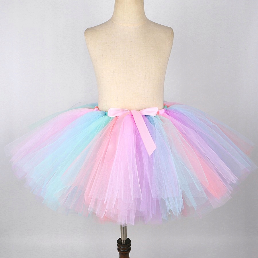 - Спідниця складається з кількох шарів різнокольорового тюлю,