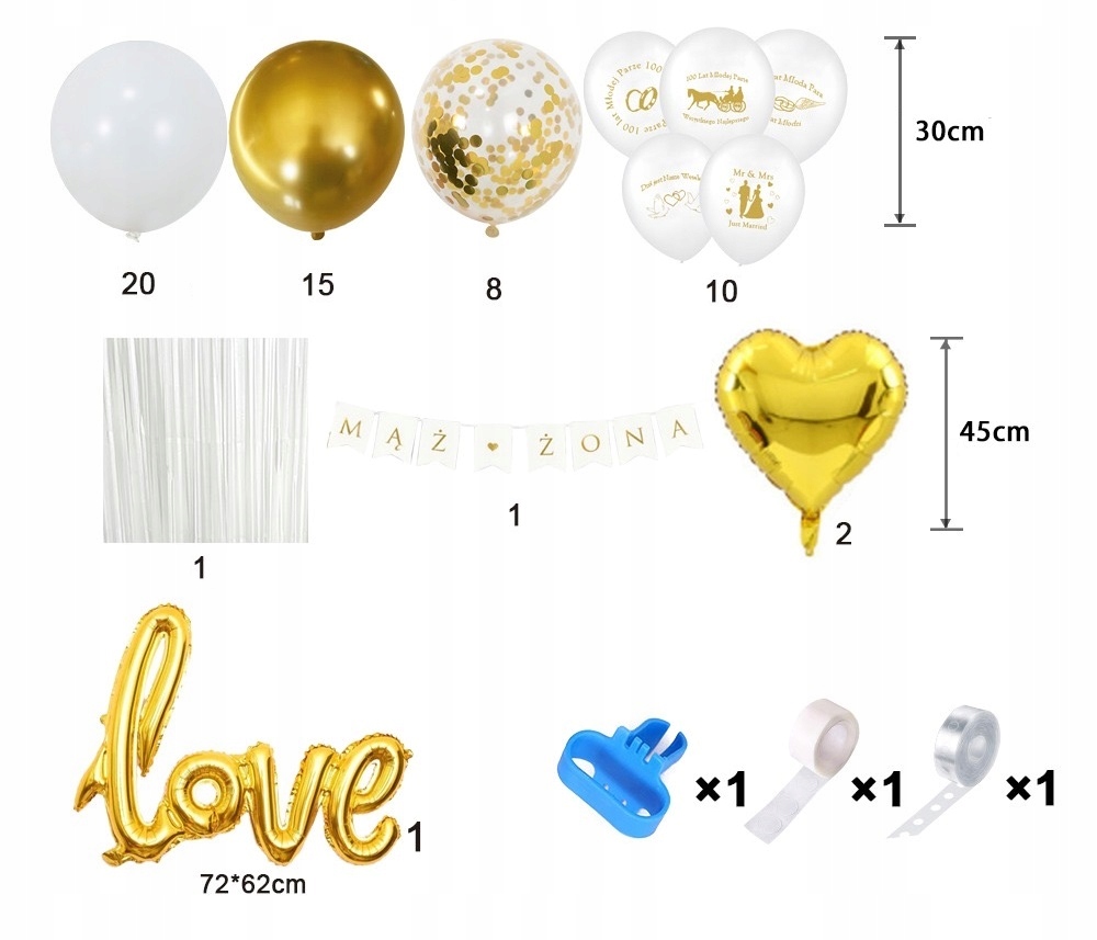 WESELE BALONY DEKORACJA SALI GIRLANDA BIAŁO ZŁOTA KONFETTI ŚLUB MĄŻ ŻONA