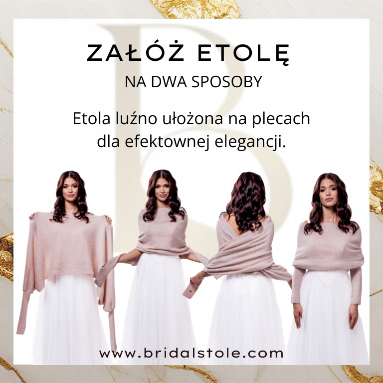 Весільна етола - чудовий вибір для кожної нареченої, яка додає її стиль та елегантність. Це ніжна хустка з рукавами, зношеними на плечах, яка характеризується універсальністю та можливістю різноманітного носіння. Зроблений з м'якої італійської пряжі, Etola характеризується високою якістю, делікатним італійським ефектом, а також є дружнім для шкіри, не викликаючи алергії чи роздратування. Завдяки довгим рукавам він забезпечує тепло та комфорт, ідеально підходить для більш прохолодних днів, особливо восени та зимового сезону. Це ідеальне доповнення до творчості весілля, що відповідає як церемонії, так і весільній вечірці.