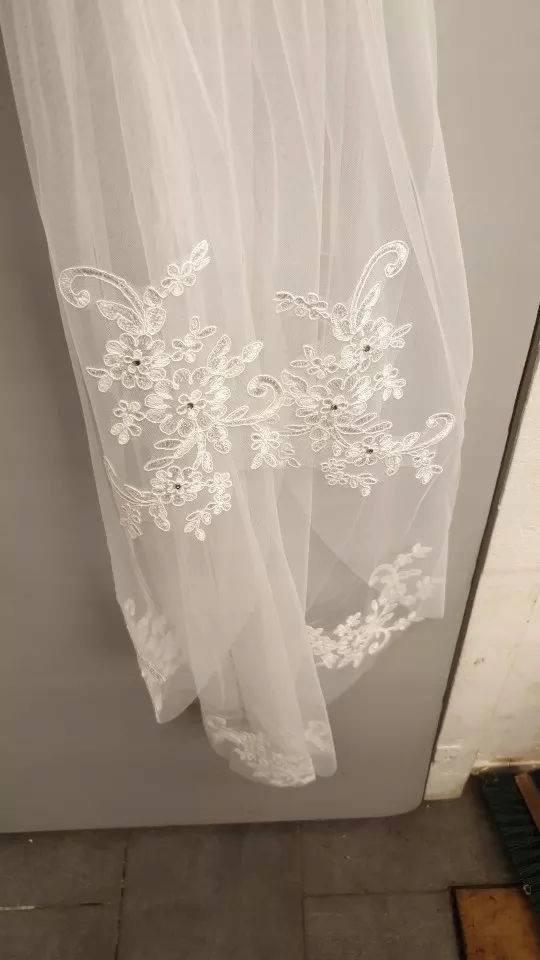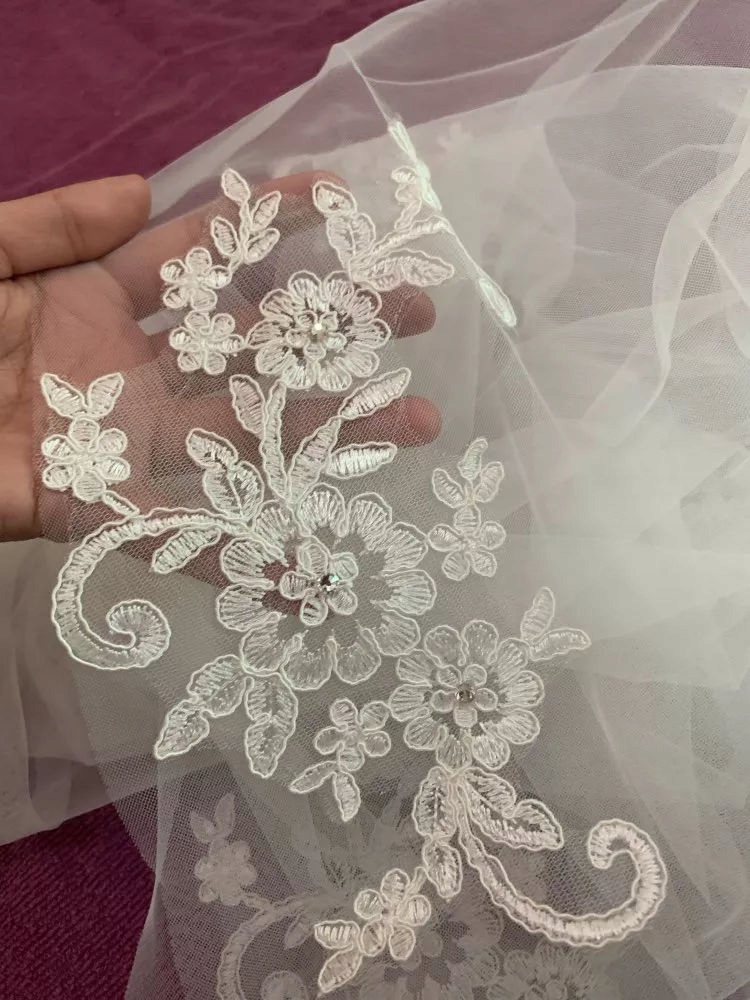 Весільна одношарова фата, приблизно 90 см, з вишитими мереживними аплікаціями, прикрашеними цирконами.
