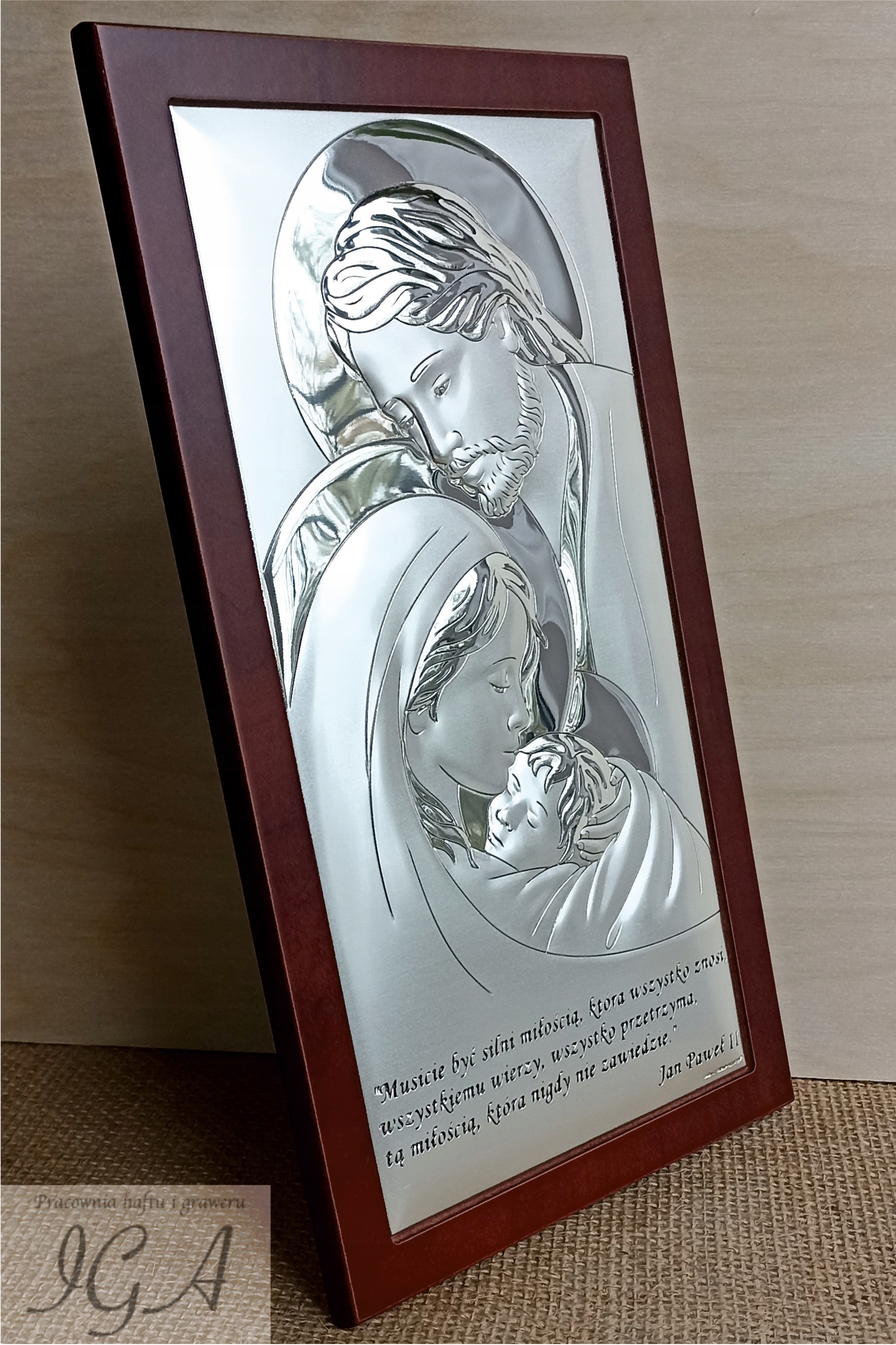 Срібна картинка на бронзовій дереві Свята родина з цитатою від Івана Павла II "Ви повинні бути сильною любов'ю ..."