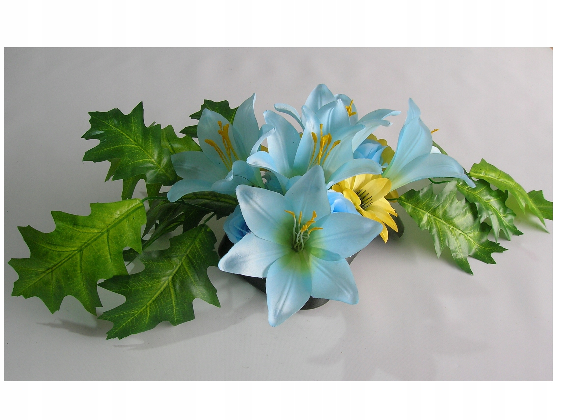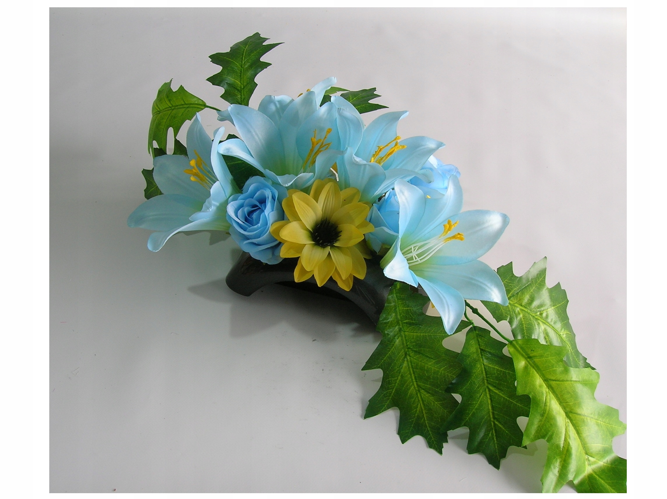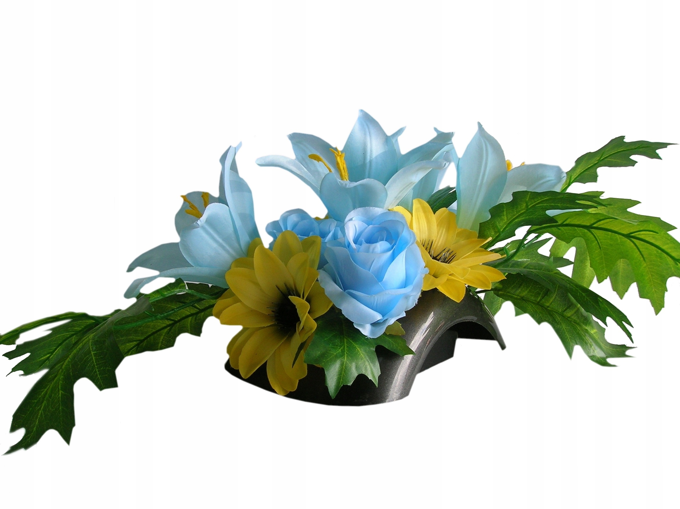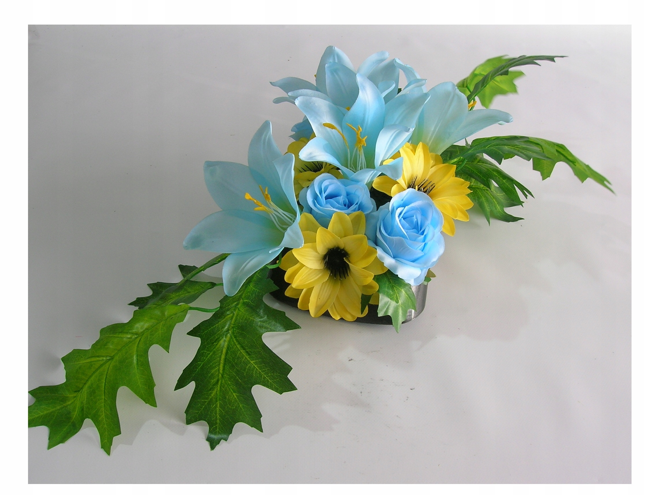 Предмет пропозиції - сучасна композиція зі штучних квітів жовтих жоржин, блакитних лілій і троянд. Це дуже ніжна композиція з квітів у світлих тонах, які додатково прикрашені дубовим листям. Все це виконано в надгробній ікебані графітового кольору.