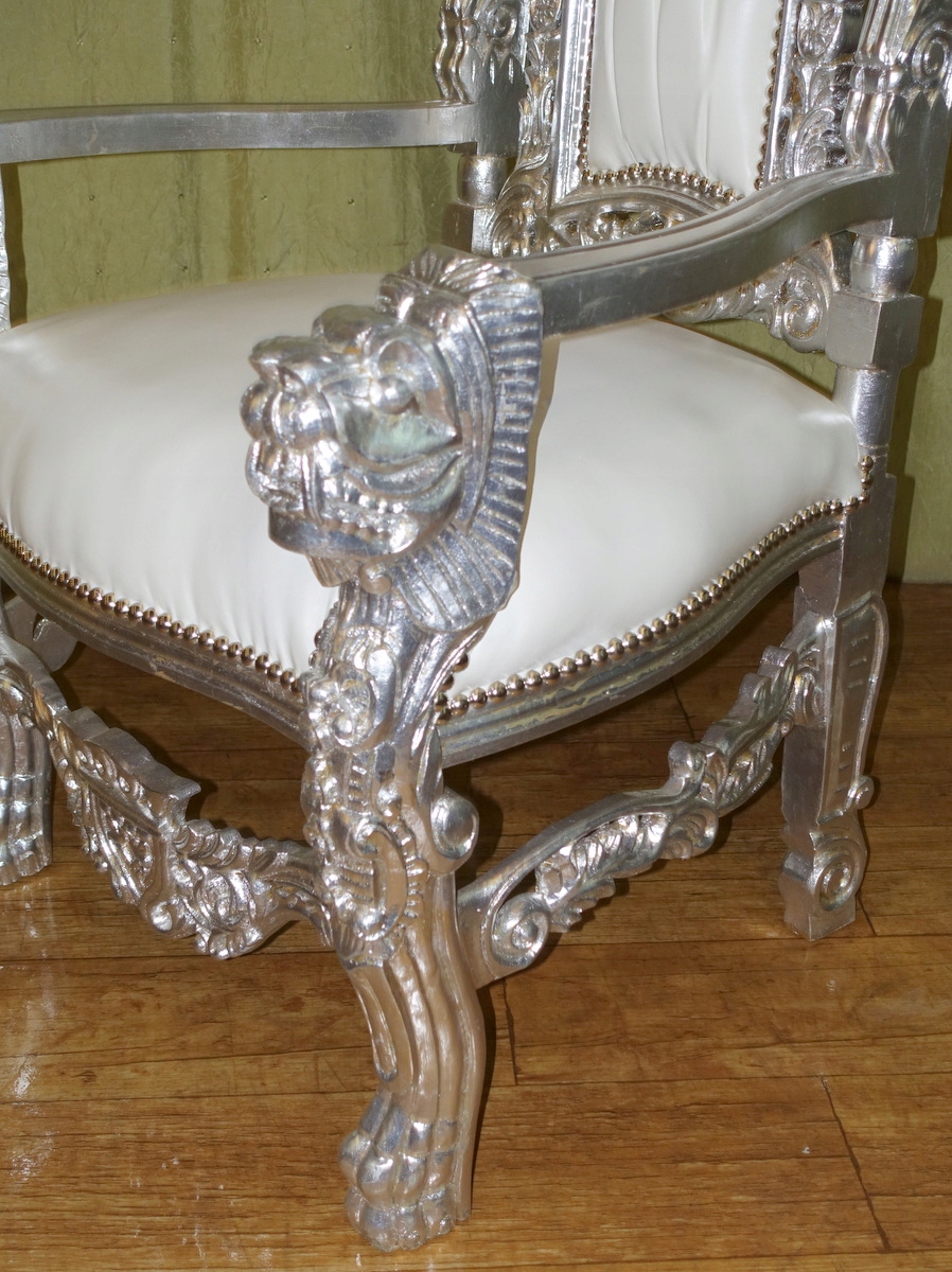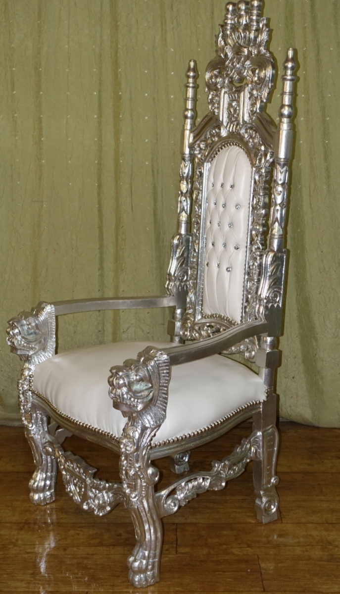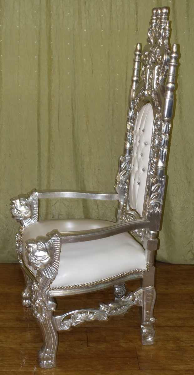 Стильне крісло - трон. Дерев'яна конструкція, як і належить стилю бароко, багато різьблена сріблом. Біла оббивка з екологічної шкіри, естетично оброблена нікельованою шпилькою, стьобана на спинці та прикрашена блискітками Swarovski. Предмет меблів, виконаний у сучасному стилі, зберігаючи старовинні форми.
