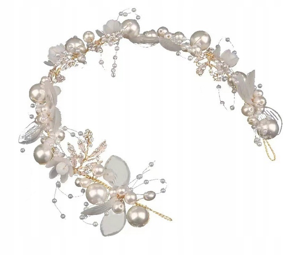 - Колір об'єкта: дріт, виготовлений з основного металу в золотому кольорі, на якому білі квіти, перли та золоті листя суспендовані