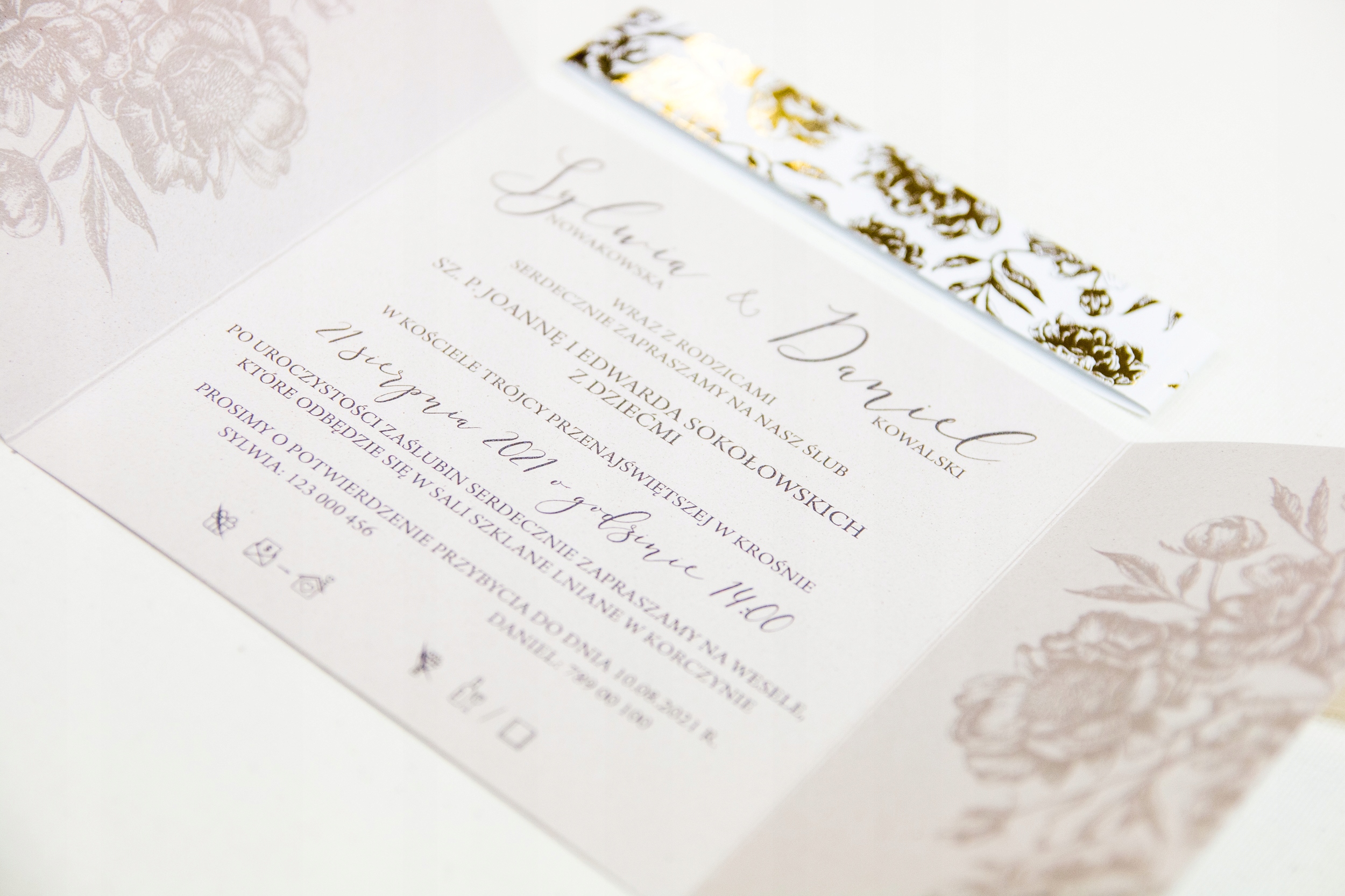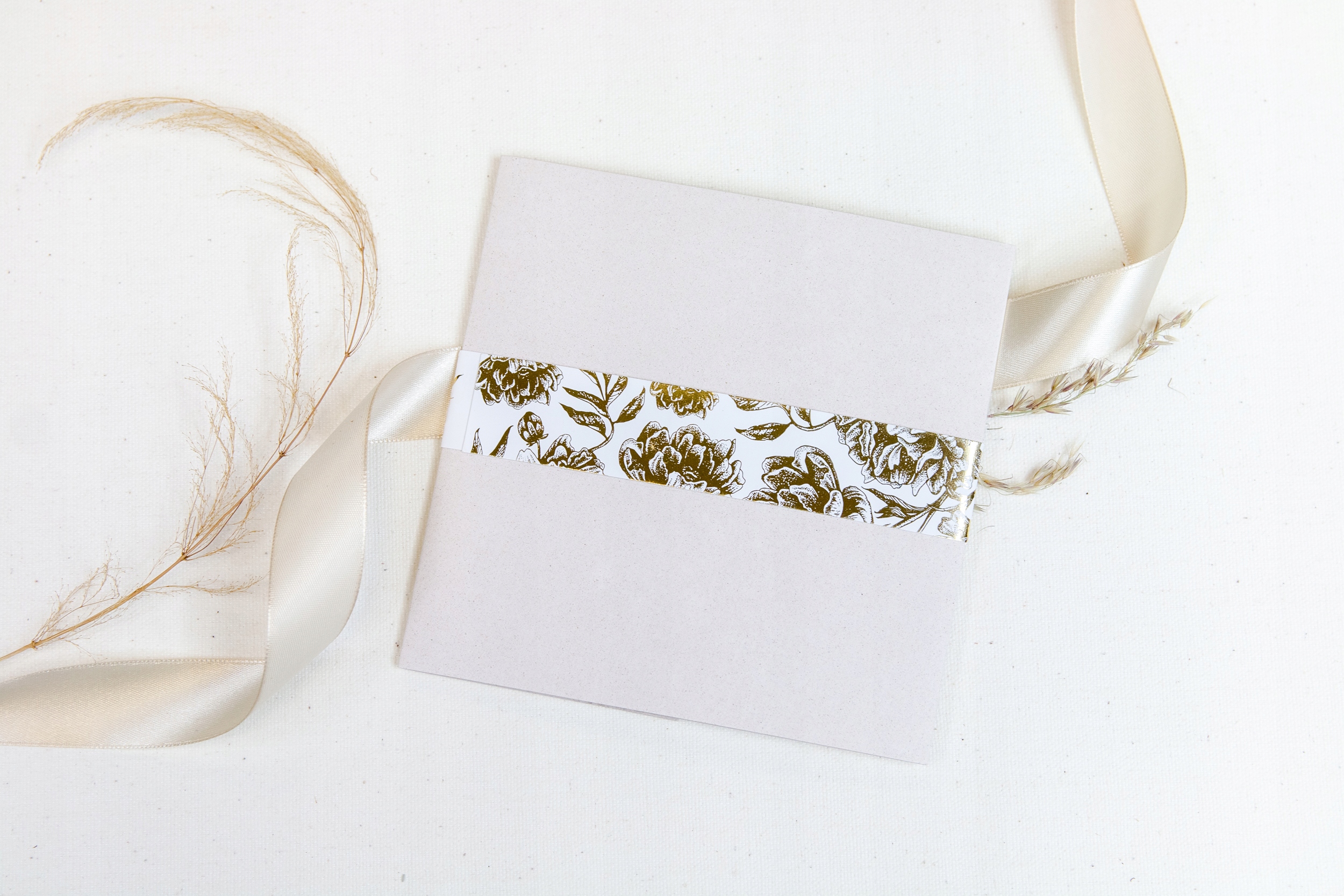 Нейтральні, світлі кольори запрошень підкреслені позолоченим жакетом у двох дизайнах - на вибір.