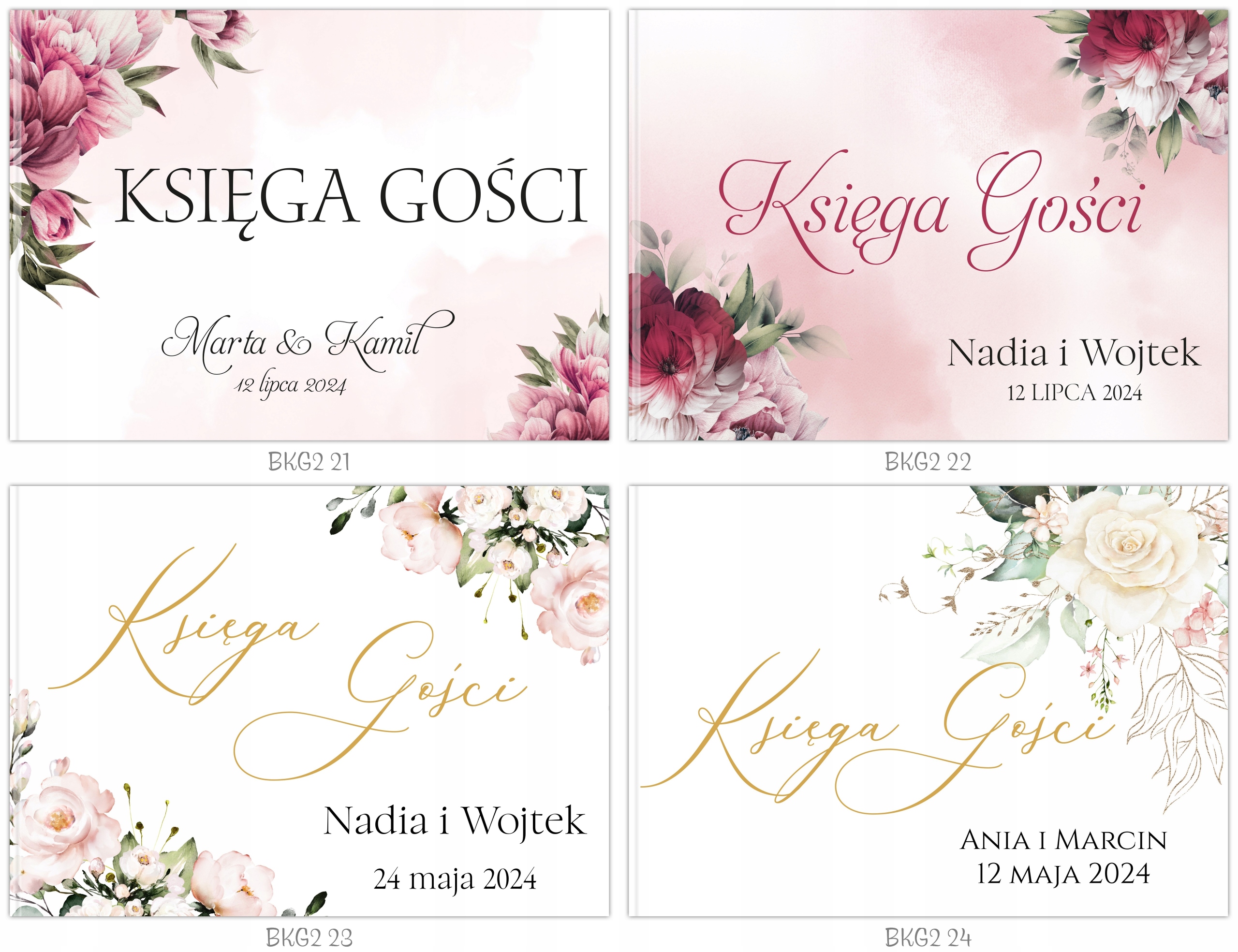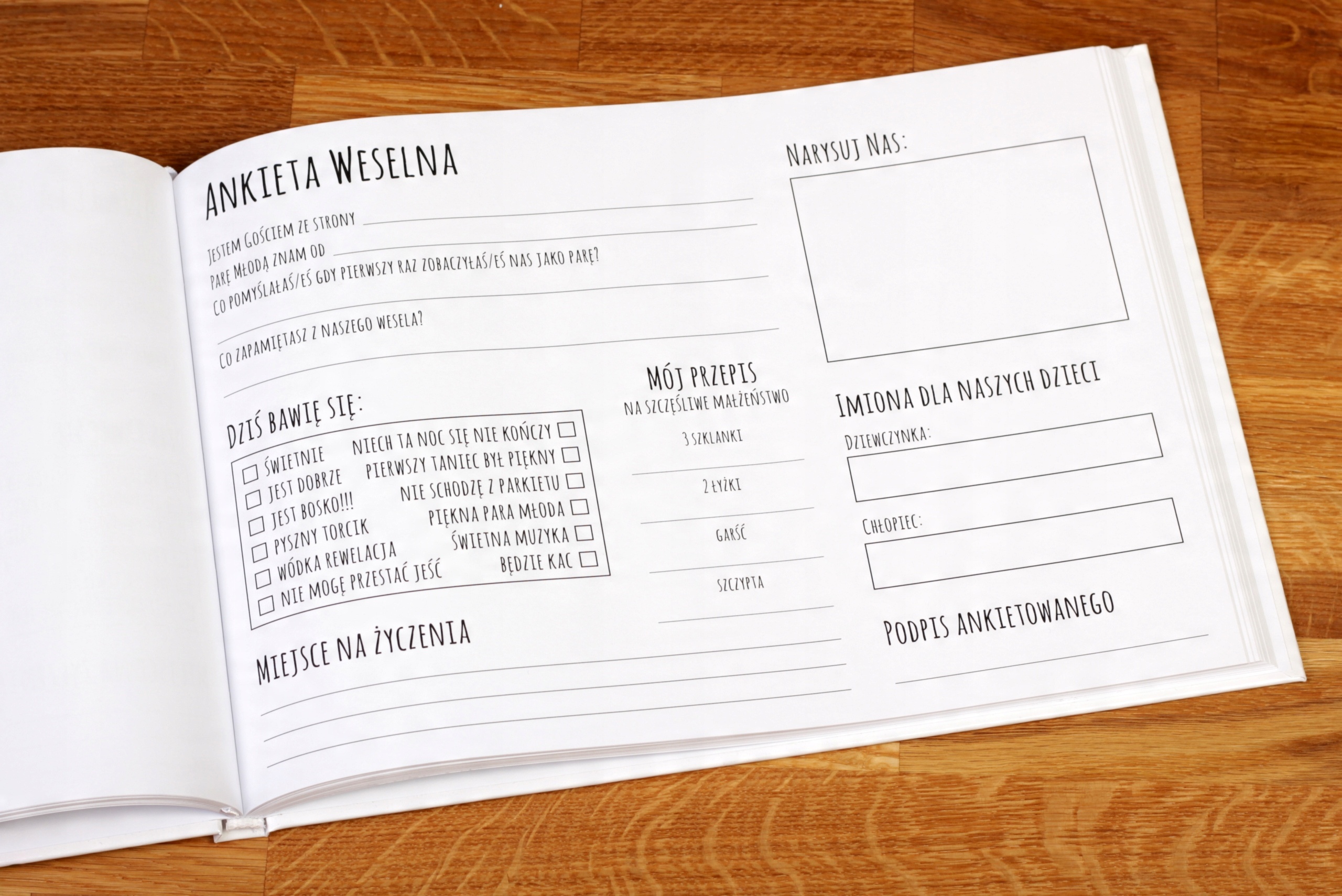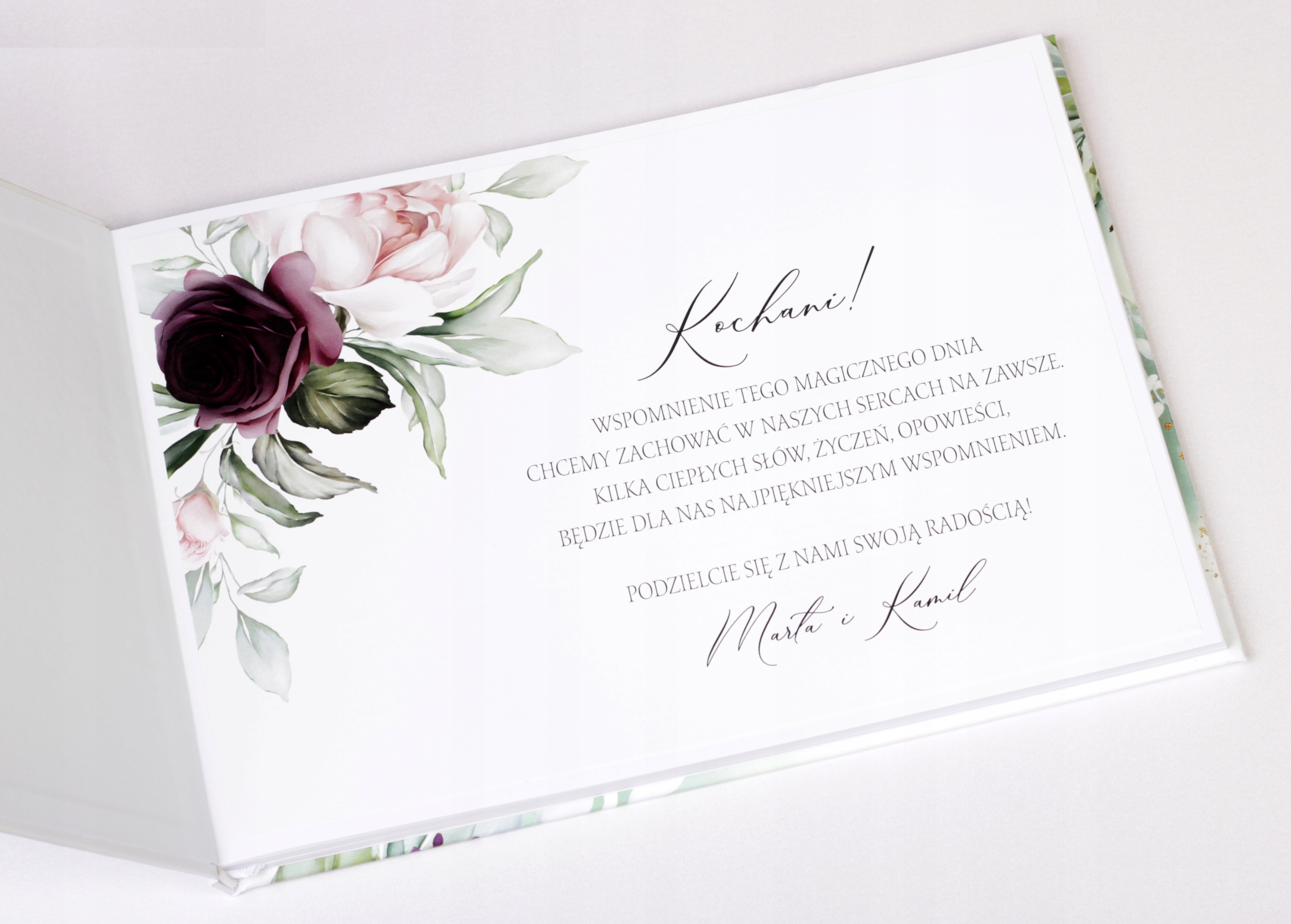 Замовляючи гостьову книгу з цього аукціону, ви можете вільно вибирати, серед іншого: колір шрифту, графічне оформлення, імена нареченого та нареченої, текст подяки.