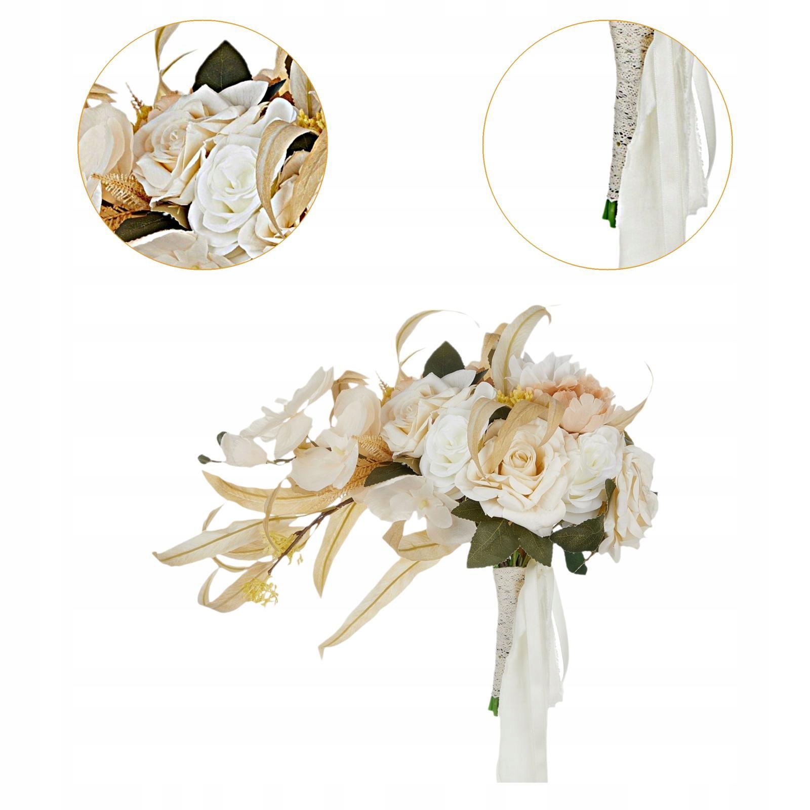 [Весільний букет]Штучні квіти складаються із зеленого листя, троянд та інших квітів з декоративними стрічками, красиві та красиві, створюючи чарівну, класичну та елегантну атмосферу