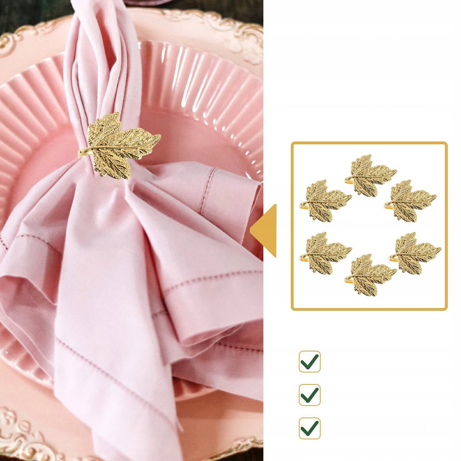 ✅ Ви схиляєтесь приємні кільця для серветок? Ці креативні пряжки для серветів будуть для вас придатними. Виготовлені з найвищої якості матеріалу з нержавіючої сталі, вони блискучі та ніжні. Вишукана майстерність та творча форма листя змушують їх стати хорошими прикрасами обіднього столу при кожній нагоді.