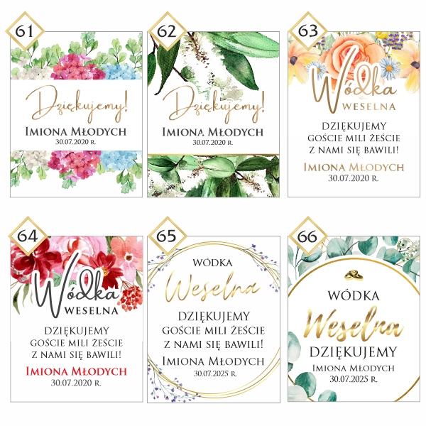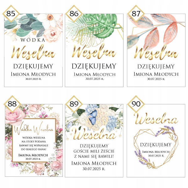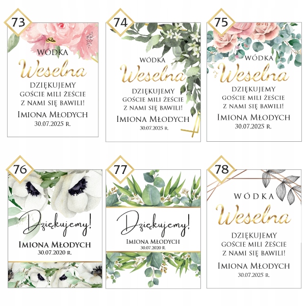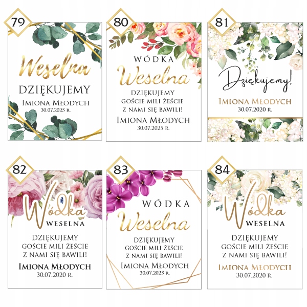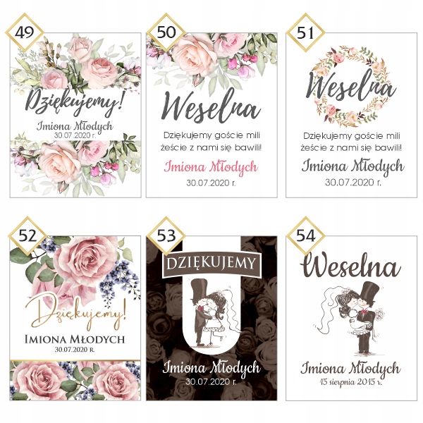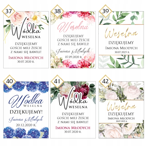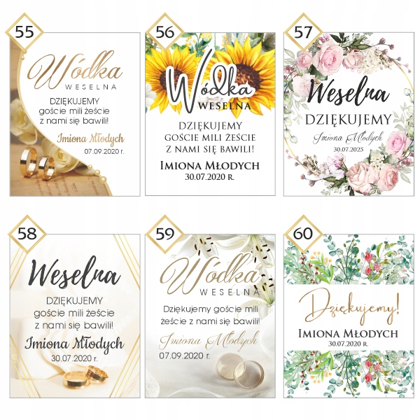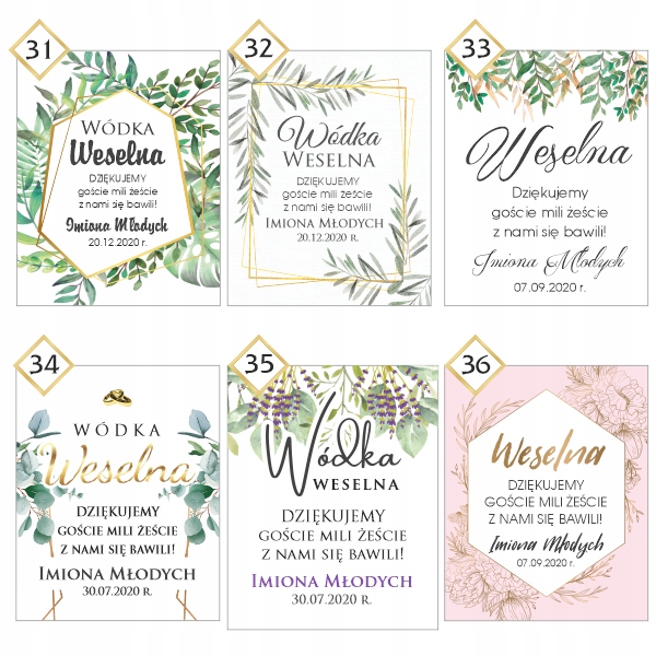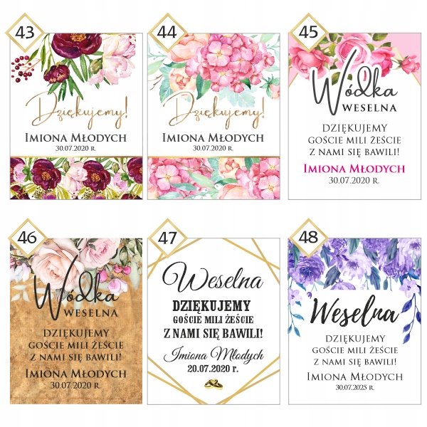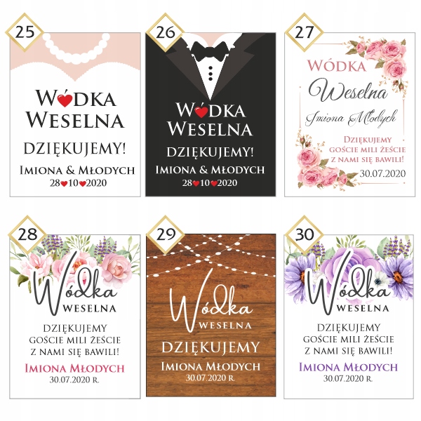наклейок на грудях, що відповідають більшості пляшок, потужністю 100 мл з іменами та датою весілля нареченої та нареченої. цифрові друковані наклейки на фользі, яка гарантує відмінну якість та стійкість до друку для охолодження в холодильнику, морозильній камері, магазині тощо. У кожній схемі можна додати індивідуальну поему, зміни шрифту, зміни кольорів шрифту, зміна горілки для весілля на напис, наприклад, спасибі, настоянка для весілля .. Якщо у вас є власний проект, ми раді надрукувати його для вас, це не впливає на додаткові витрати. Ми можемо підготувати індивідуальний проект, який є безкоштовно . При замовленні на 1 -му наборі наклейок у вас є один візерунок, з 2 набором 2 візерунків ... тощо. Якщо у вас є якісь питання, будь ласка