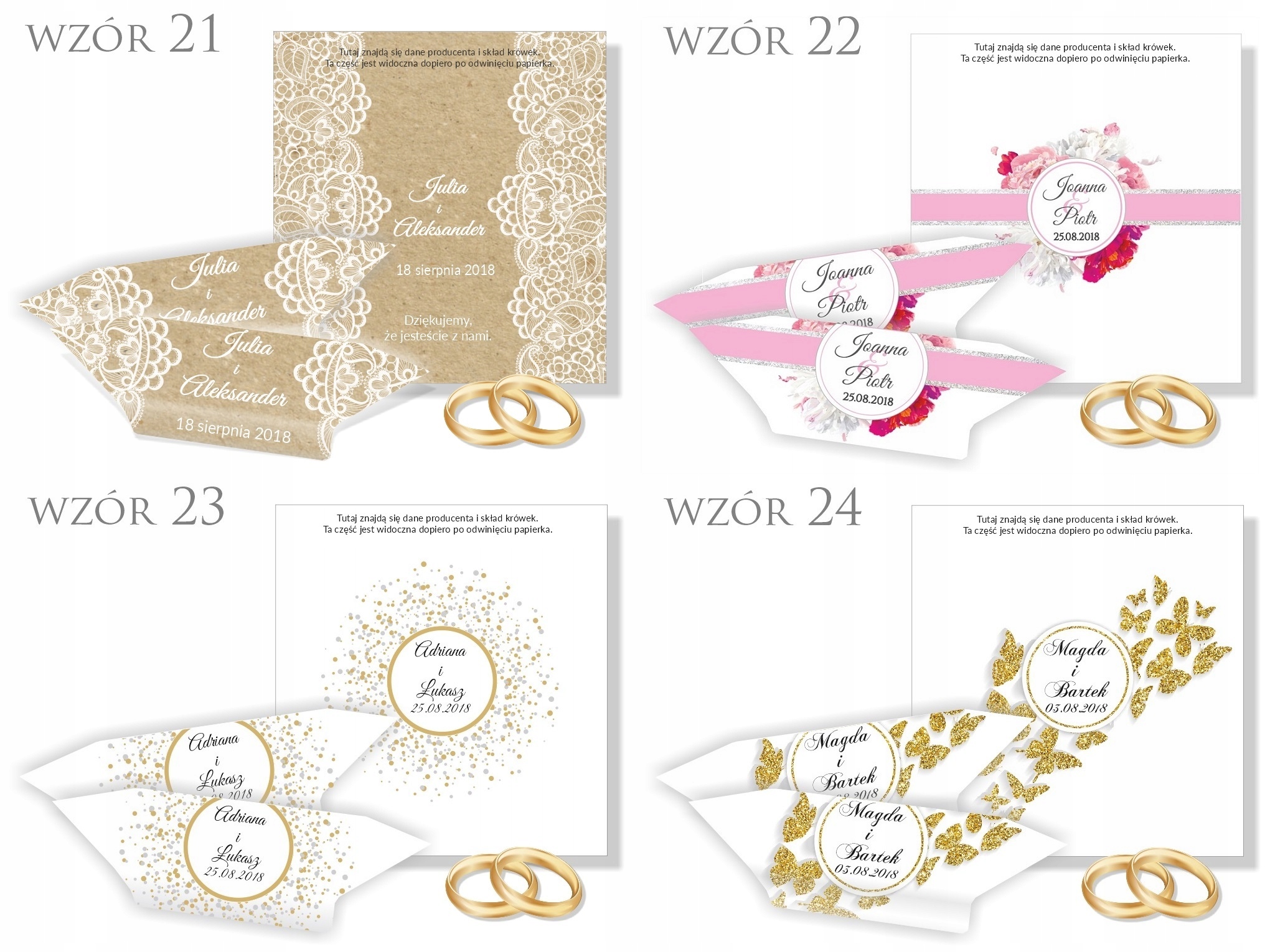 Весільні фальшири від Opole Lubelskie. Аукціон доступний на цьому аукціоні конструкції або відповідно до вашого запрошення/теми. , ванільний аромат. Ми не використовуємо консерванти, маргарин чи інші рослинні олії. Продукт глютен -. обгорнуті вручну. Вони підуть до ваших рук відразу після виробництва - м'які та тягнуть, і характерна "сльоза" буде створена приблизно через 2 тижні. Цукерки крихкі після 2 місяців виробництва залежно від методу зберігання (у випадку 1% виробництва кристалізація може розпочатися раніше). /b>.