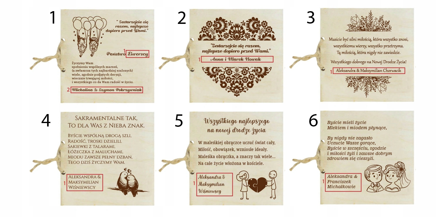 Оригінальною альтернативою традиційним рішенням стануть поздоровлення та побажання, передані молодятам у вигляді вигравіруваного напису на дерев'яній листівці.
