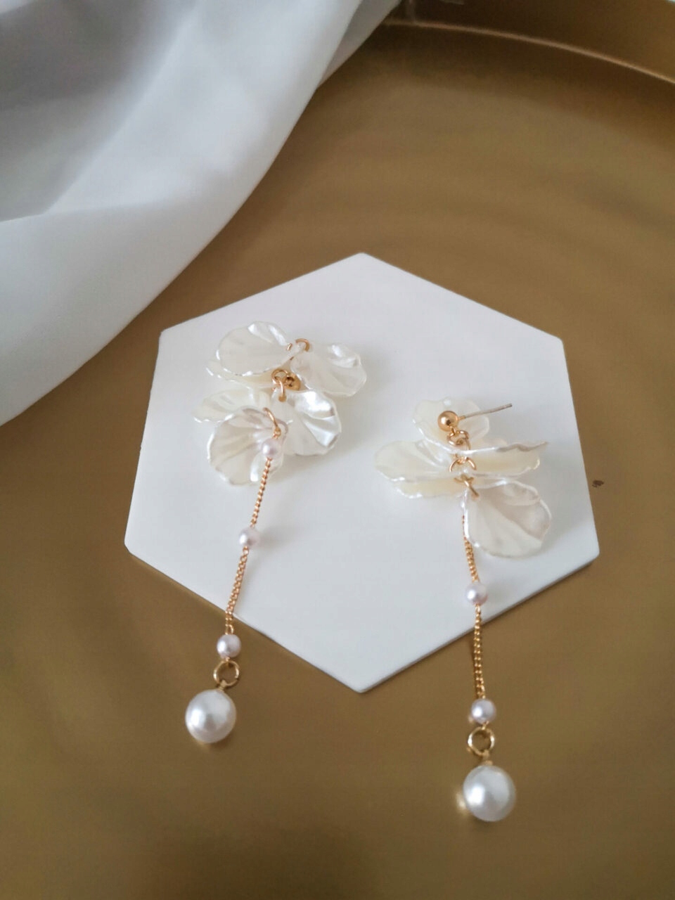 Ювелірні вироби з квітковим мотивом - це найгарячіша тенденція весілля. Сережки з пелюстками квітів, виготовленими з матеріалу, що нагадує перлинну масу, - дуже романтичне та сучасне доповнення. Пластівці в поєднанні з елементами золотого кольору та перли створюють унікальний і модний ефект, а ціле дуже легке і жіночне. Ці сережки чудово виглядають із весіллям, але також розчиненими хвилями.