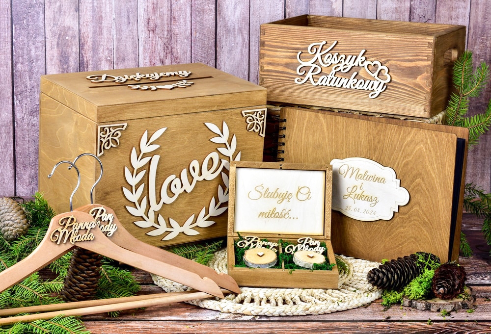 Ми запрошуємо вас ознайомитися з рештою пропозицій нашого магазину, де ви знайдете коробки для конвертів і обручок у вибраних конфігураціях і кольорах, весільні вішалки, підвіски та інші весільні прикраси.
