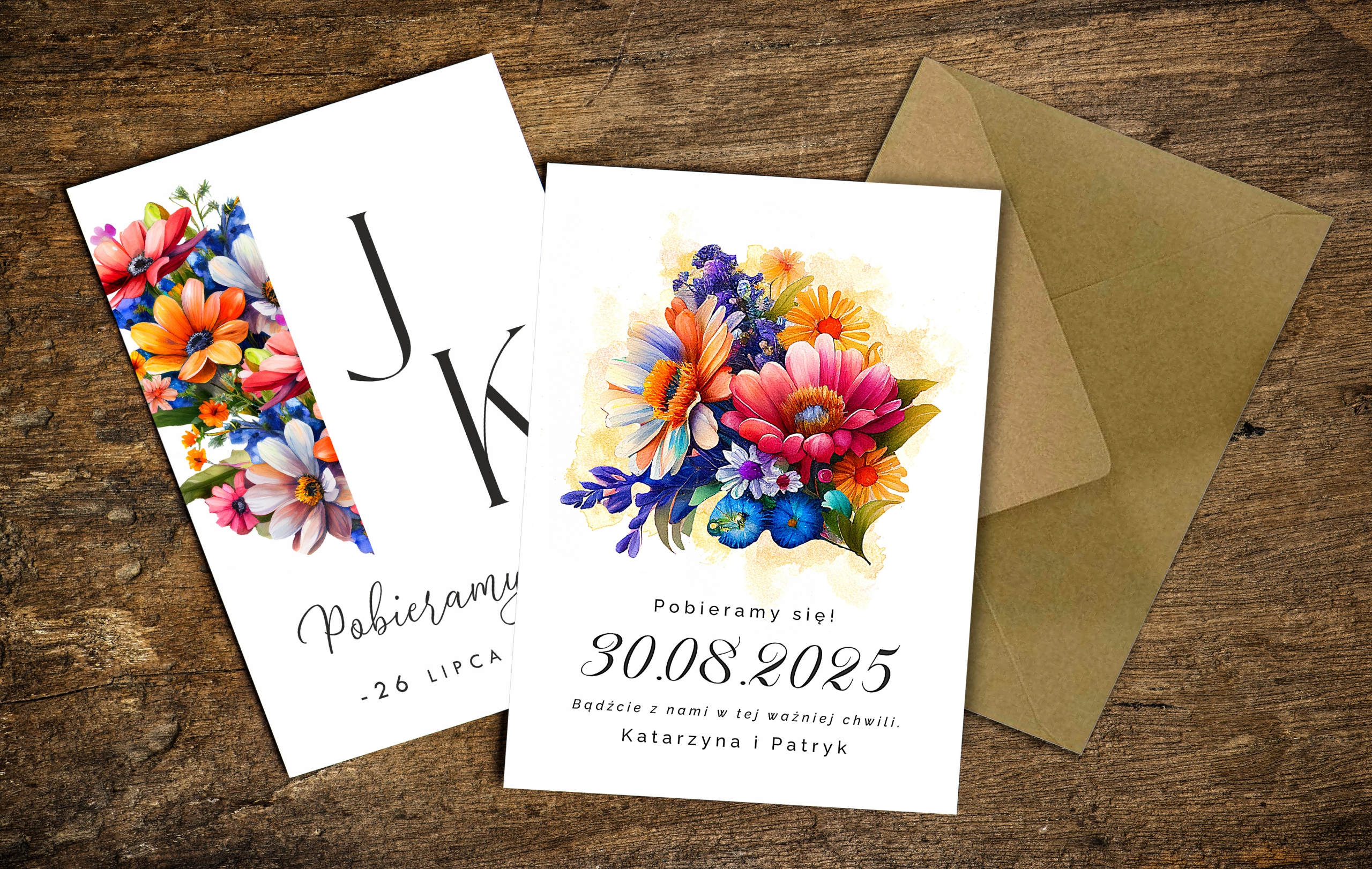 Запрошення з цієї колекції чудово впишуться у весілля в стилі рустик або бохо. Красива графіка букета, виконана в стилі акварелі, додає романтики і казкової атмосфери. Запрошення виготовляються з щільного, матового і злегка шорсткого на дотик паперу вагою до 350 г! і друк на професійній машині повний яскравих, насичених кольорів і точно відтворених деталей.