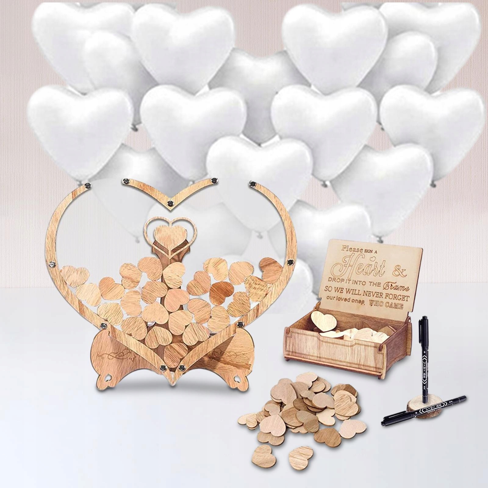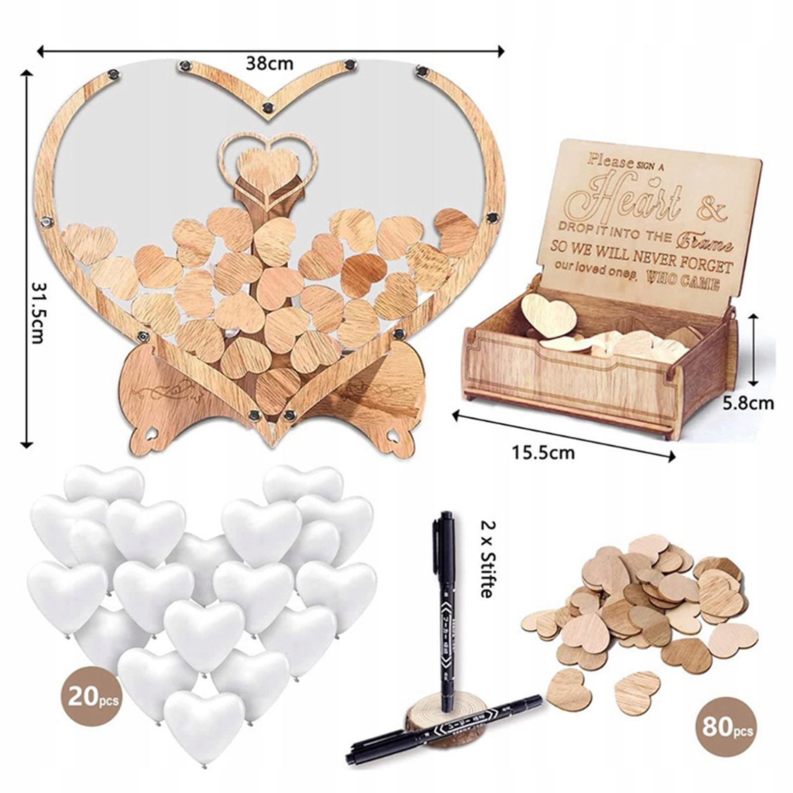 [Пакет включає]: набір весільних гостьових книг, включаючи 1 рамку для гостьової книги у формі серця, 1 коробку для зберігання, 80 дерев’яних сердечок, 20 повітряних кульок у формі серця, 2 фломастери та 1 Дерев’яний тримач для ручок.