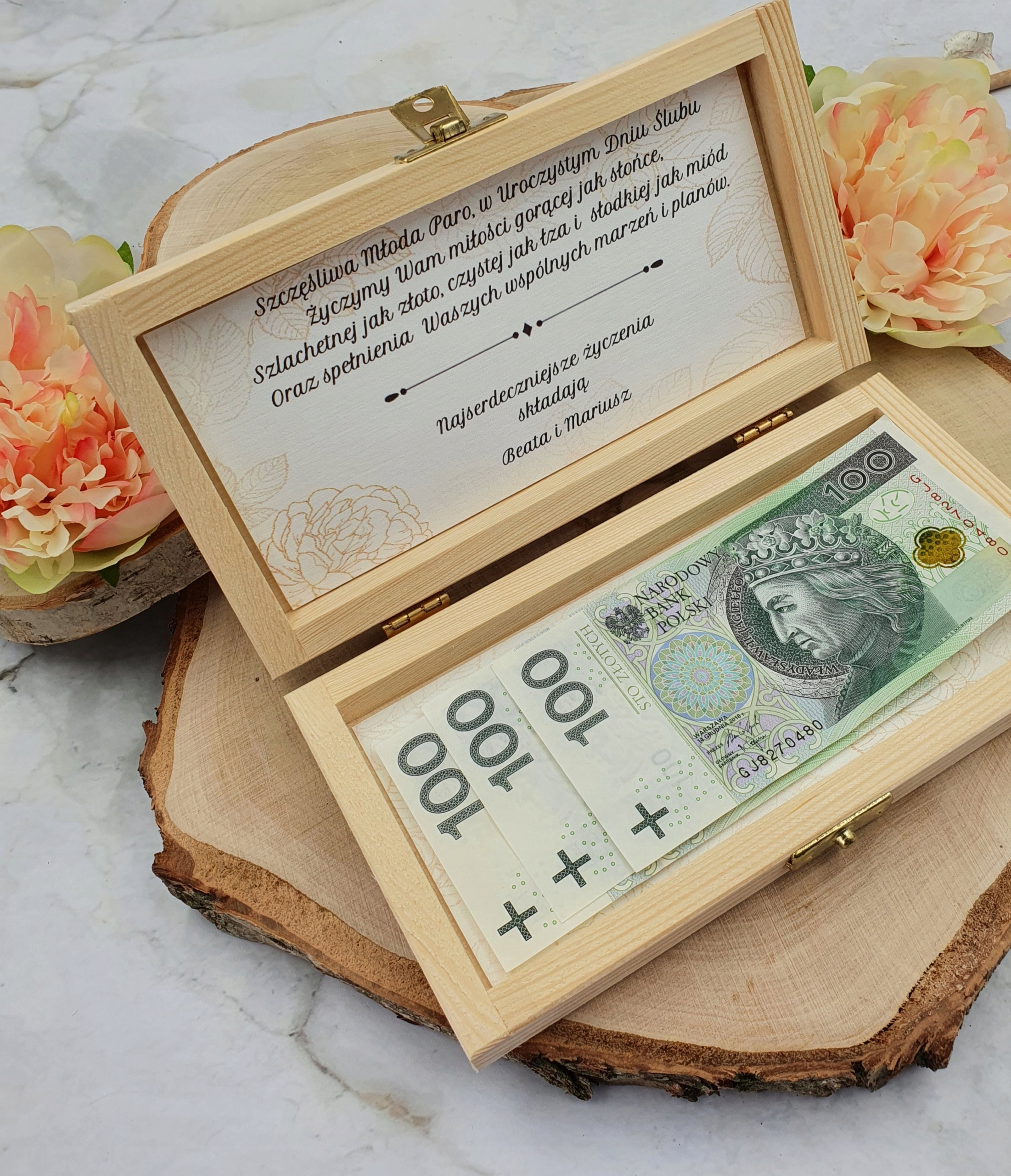 Коробка містить імена нареченої та нареченої, а також людей, які дарують подарунок. Ви також можете вибрати велику кількість весільних побажань. Ви можете надіслати своє.