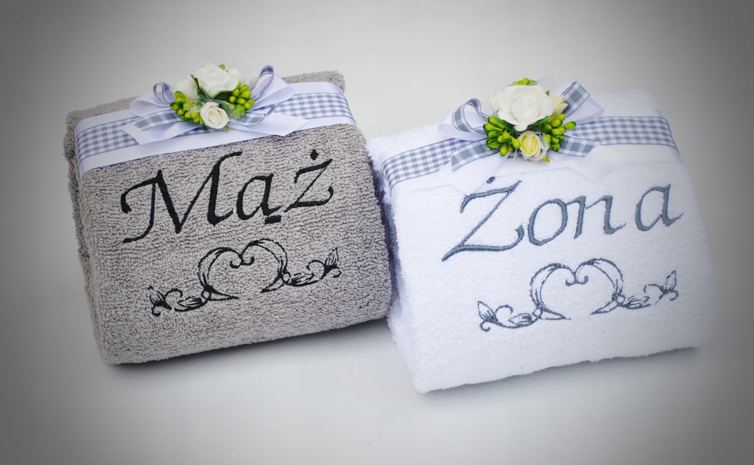 - модний набір товстих рушників 50х100см, сірий з чорною вишивкою Дружина/Чоловік + декор. аплікаційна графіка,