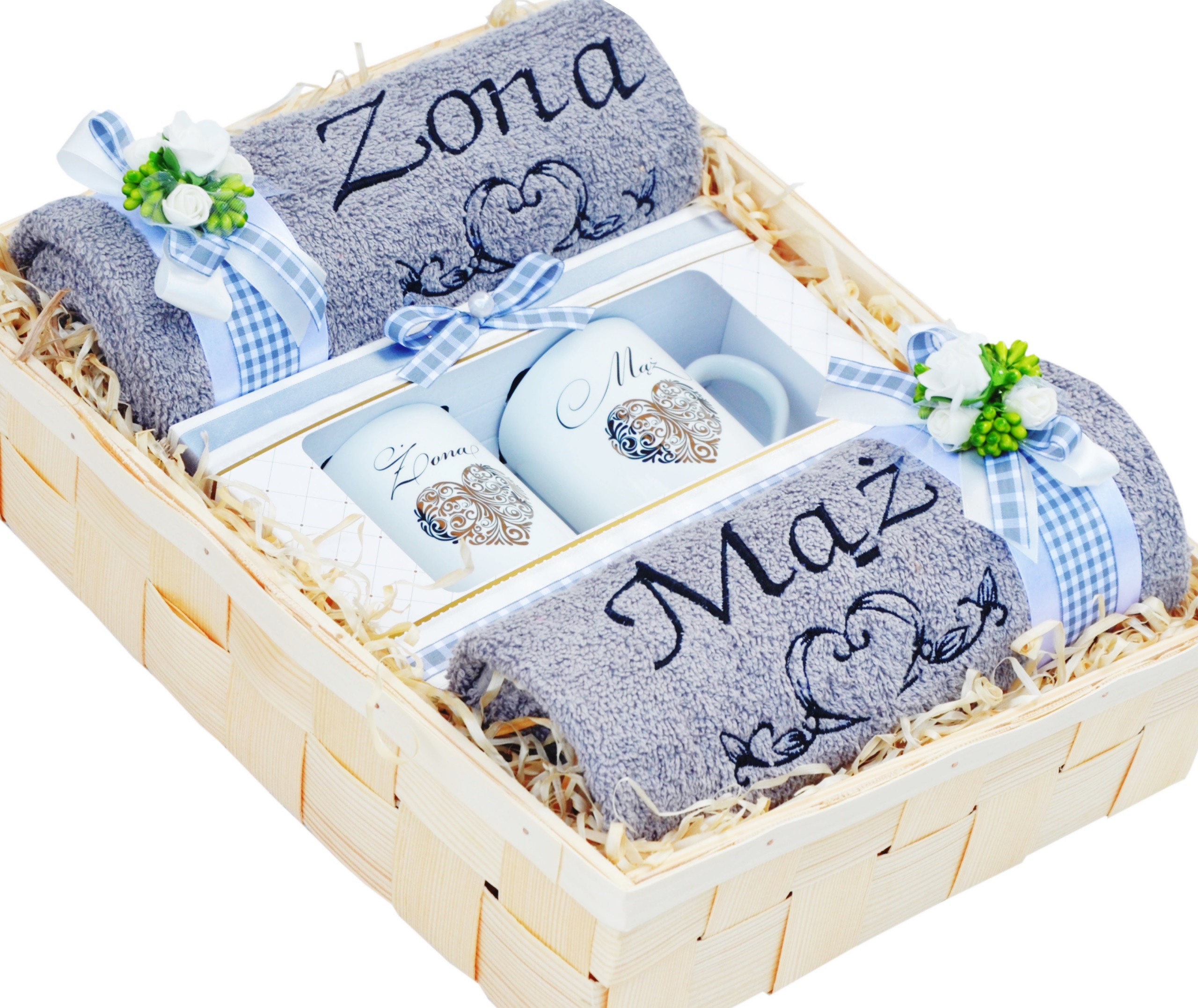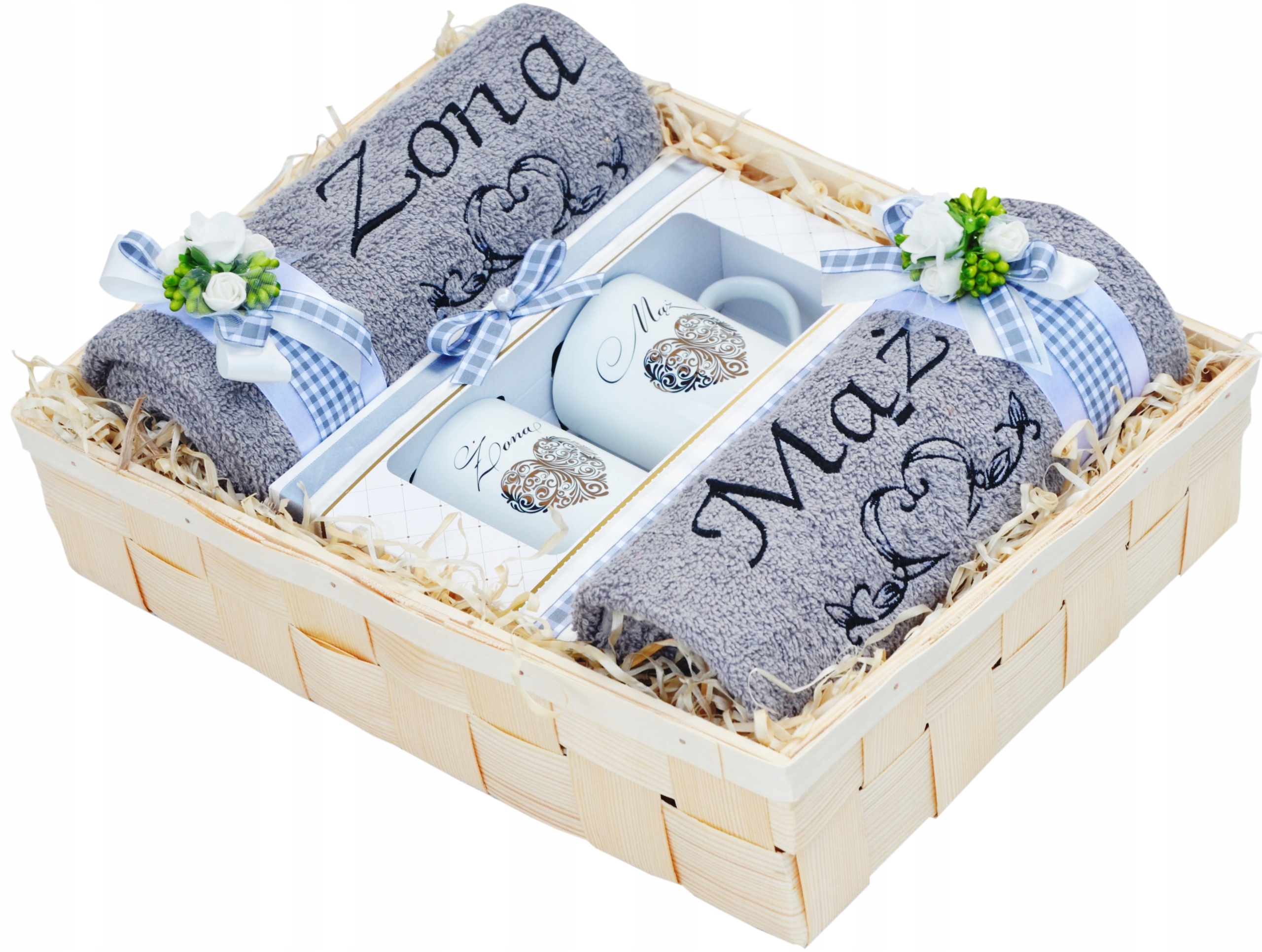 У кожному наборі ви отримуєте два сірих рушники з вишивкою «Чоловік/Дружина» та декоративною графікою.