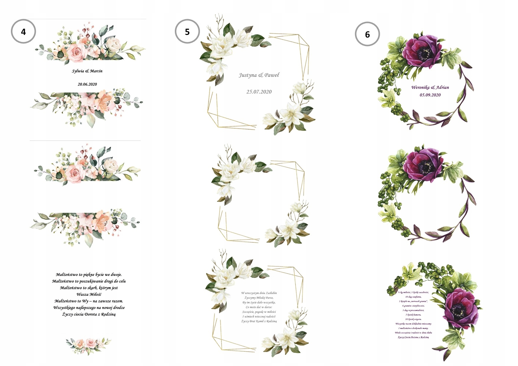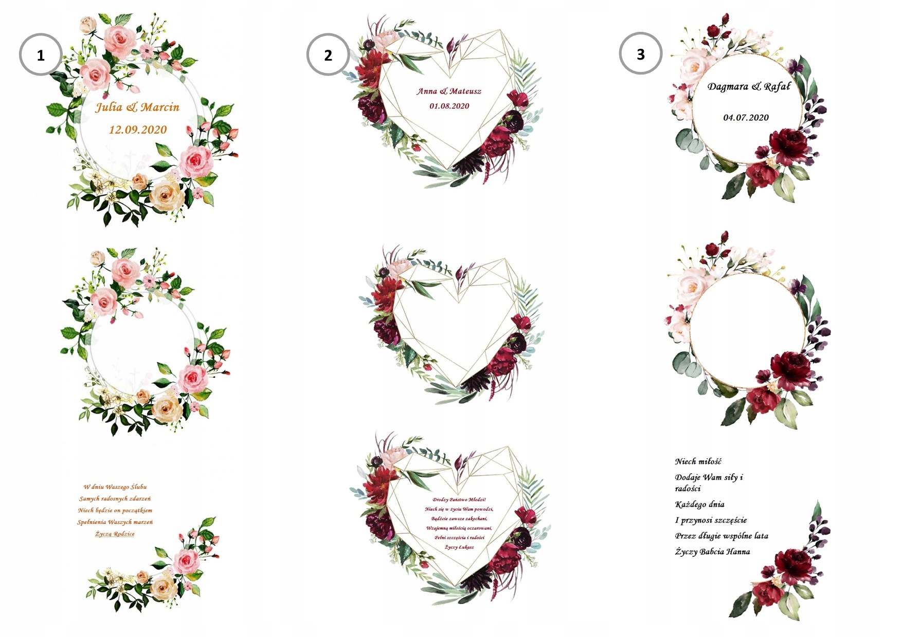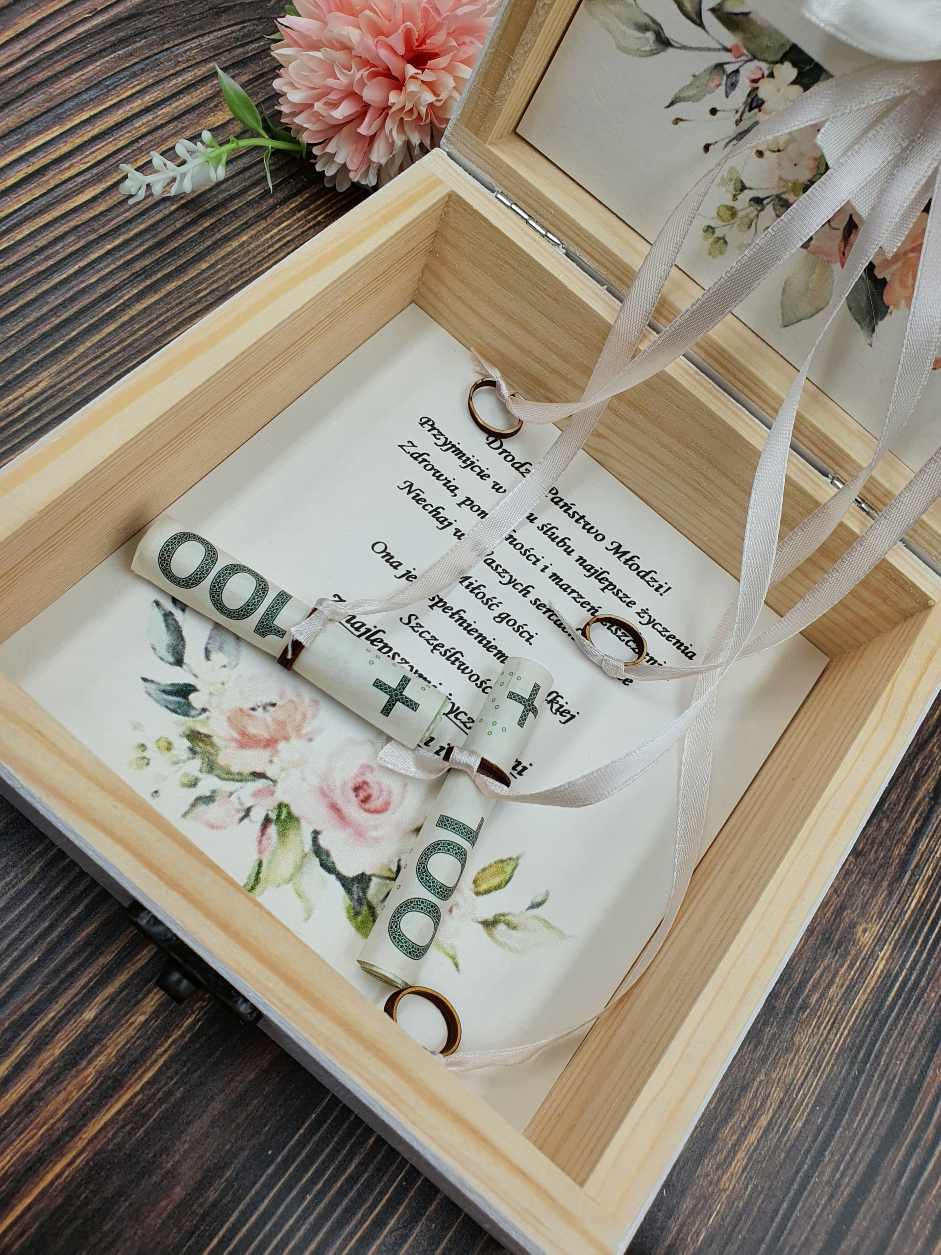 У коробці містяться імена нареченого і нареченої, а також імена людей, які дарують подарунок. Ви також можете вибрати з великої кількості побажань на весілля (ви можете надіслати свої власні) і 6 квіткових зображень (кожне з бантом у верхній частині коробки та всередині).