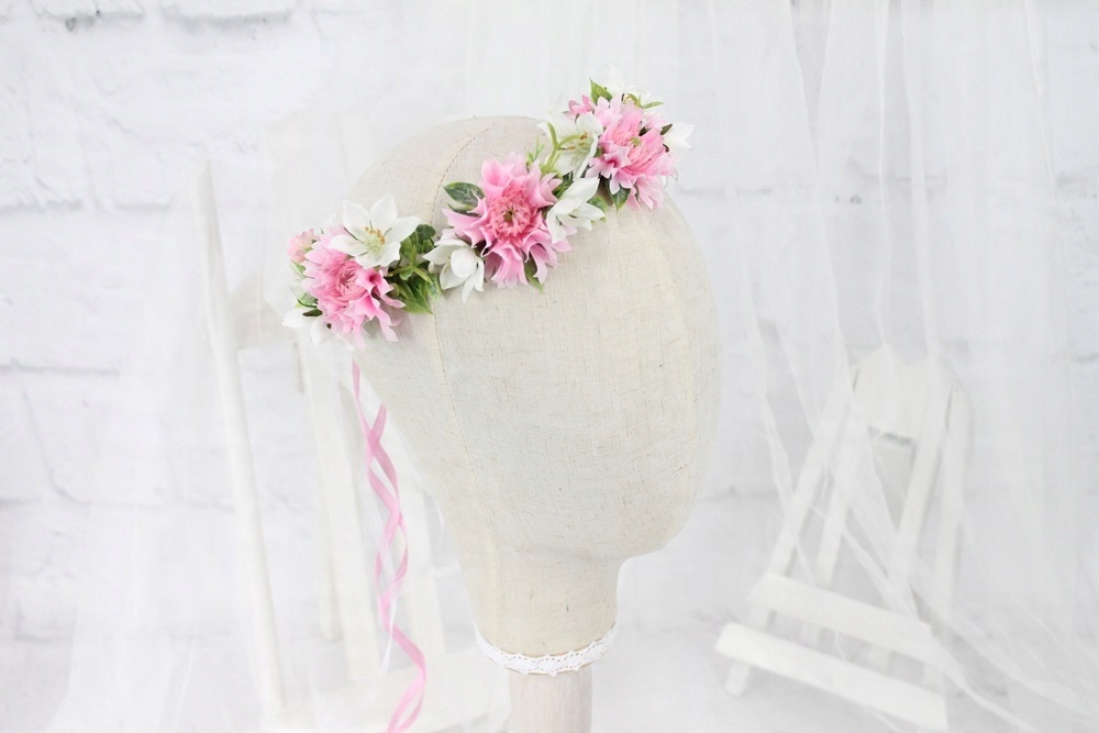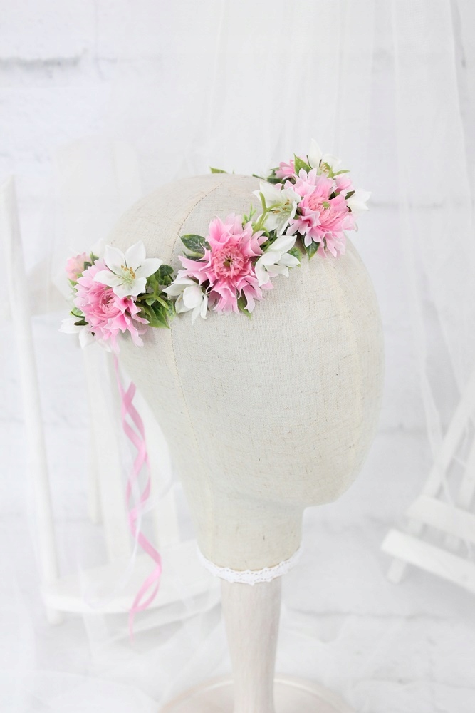 Гарний і неповторний весільний вінок зі штучних польових квітів і бутонів волошок, жасмину у відтінках рожевого і теплого білого, а також елегантних доповнень із зеленої трави, які ідеально відповідають сучасним трендам.