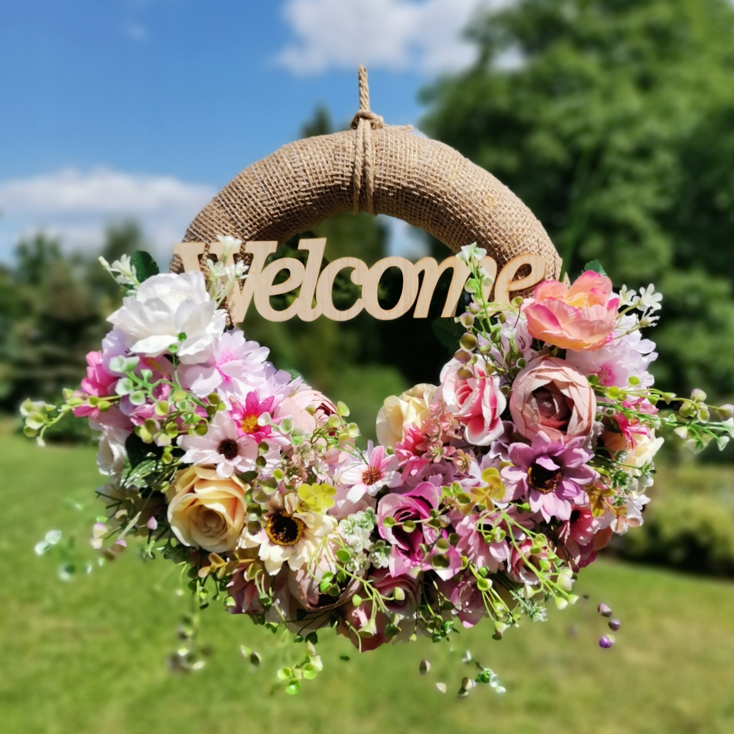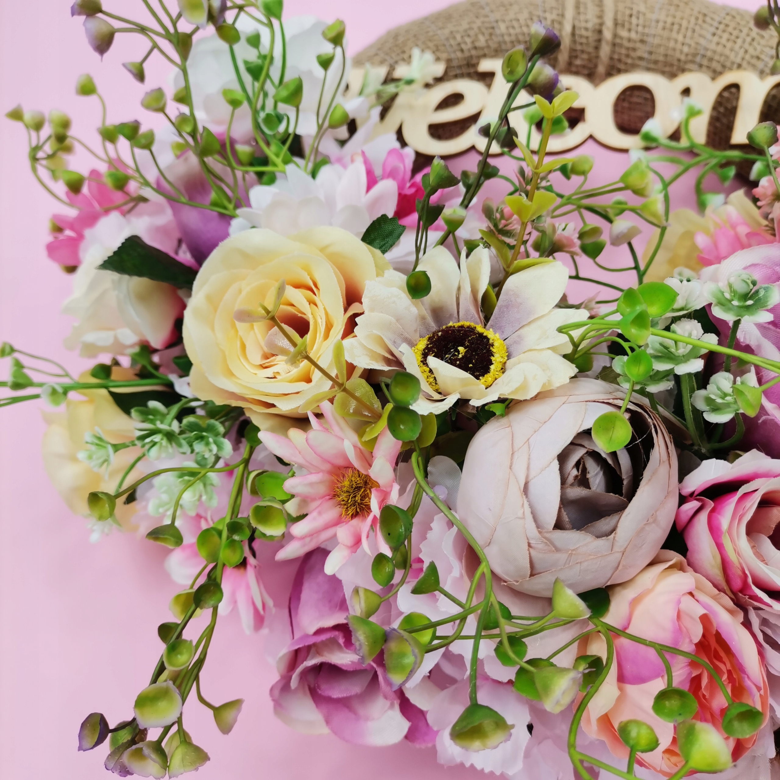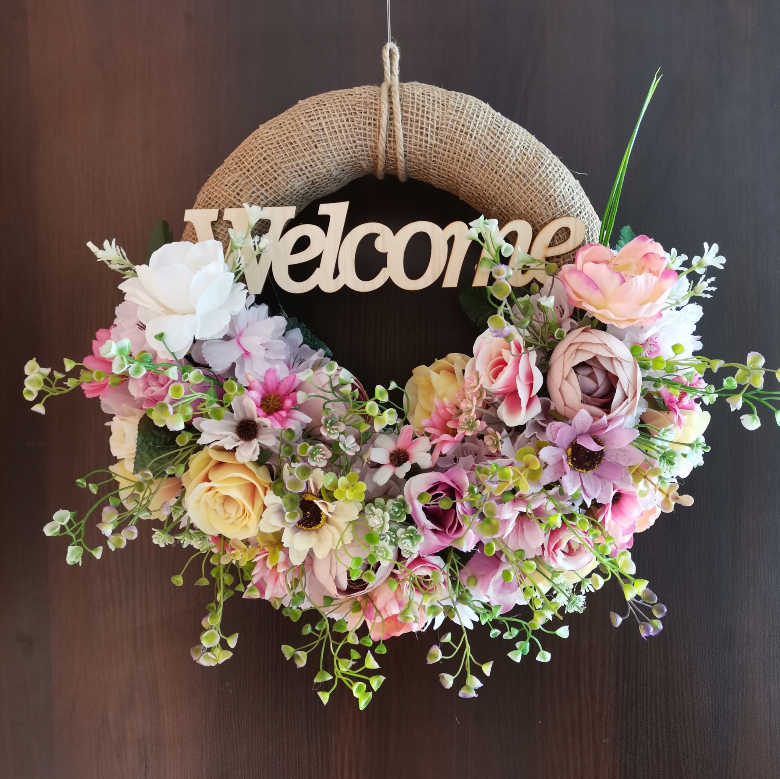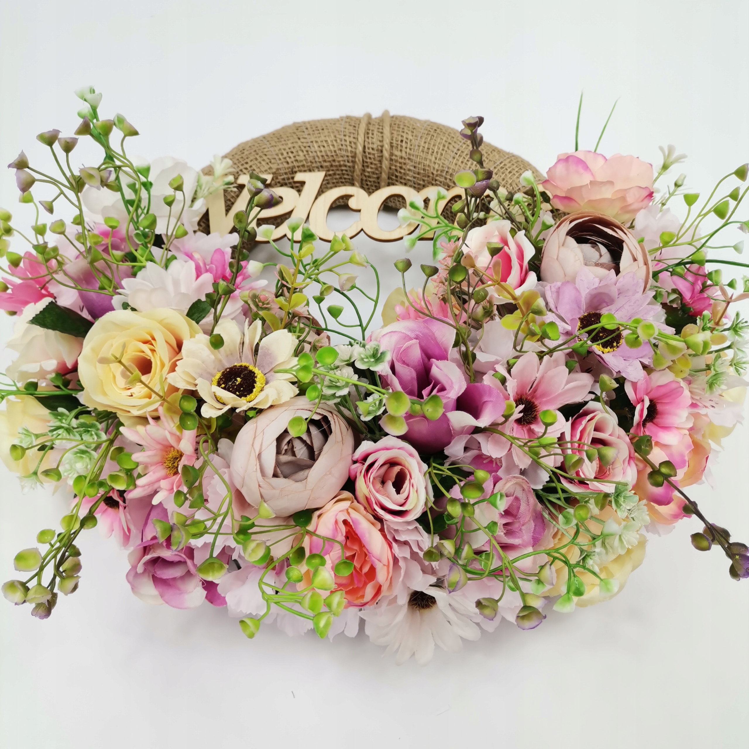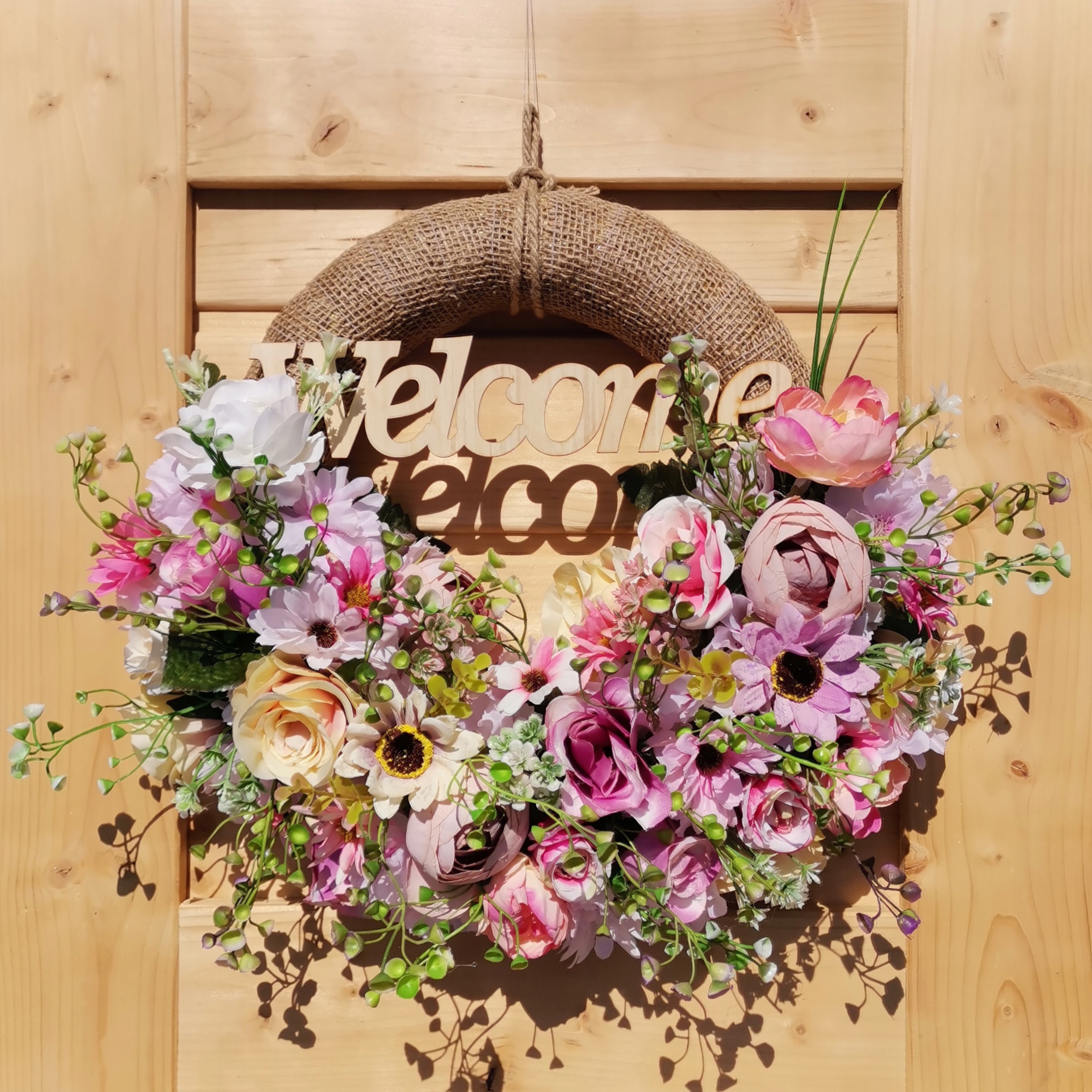 Ми представляємо вашій увазі декоративні вінки ручної роботи в широкій колірній гамі, прикрашені високоякісними штучними квітами, зеленими гілочками та флористичними аксесуарами.