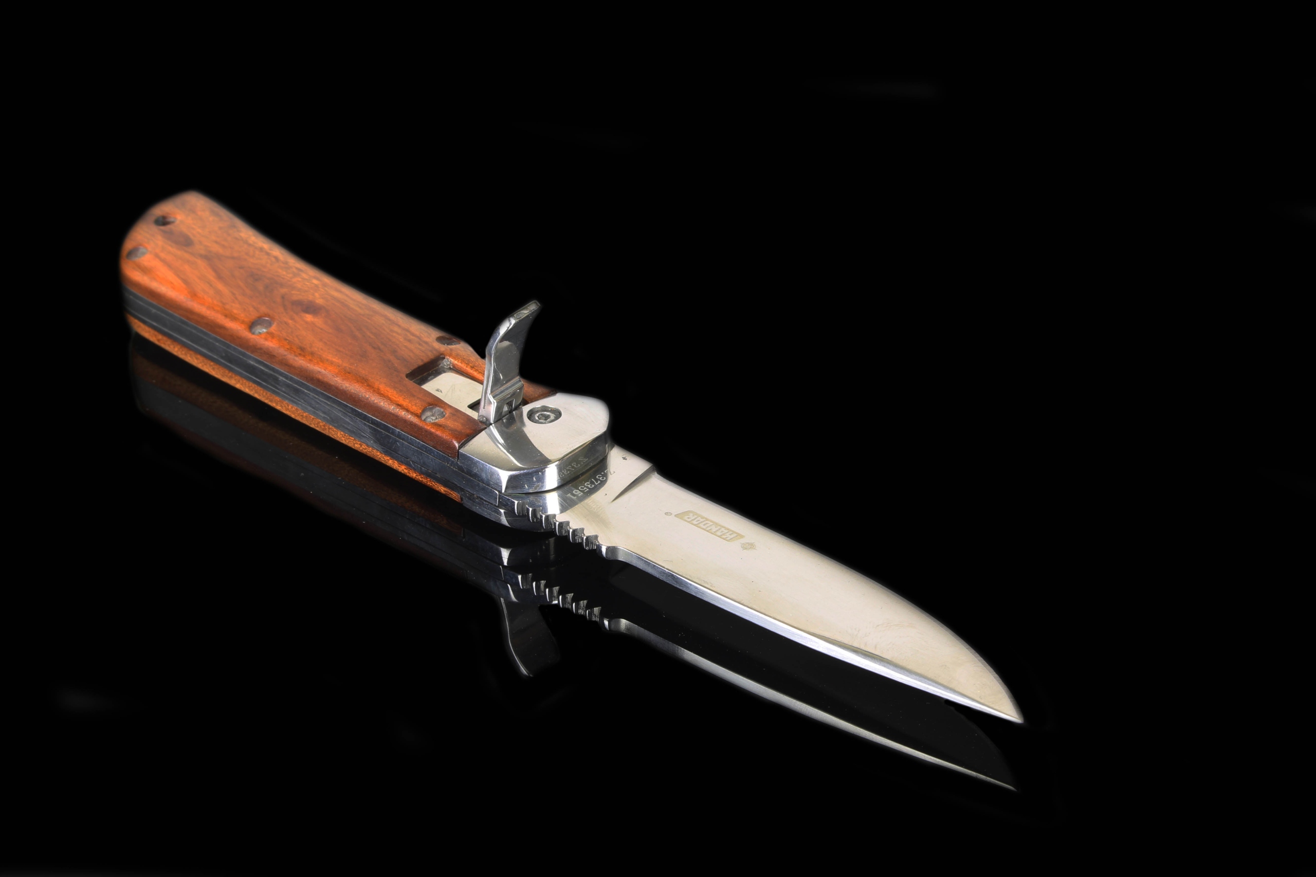 Нож відкривається збоку, механізм дуже сильний і сповільнюється, натиснувши язик на ручку.