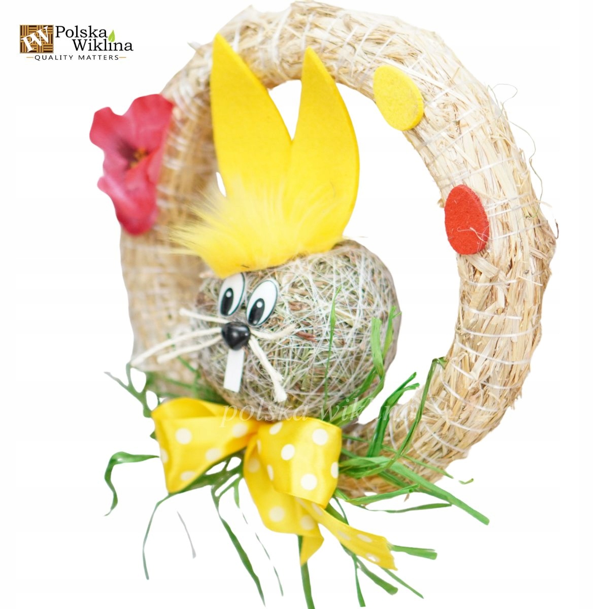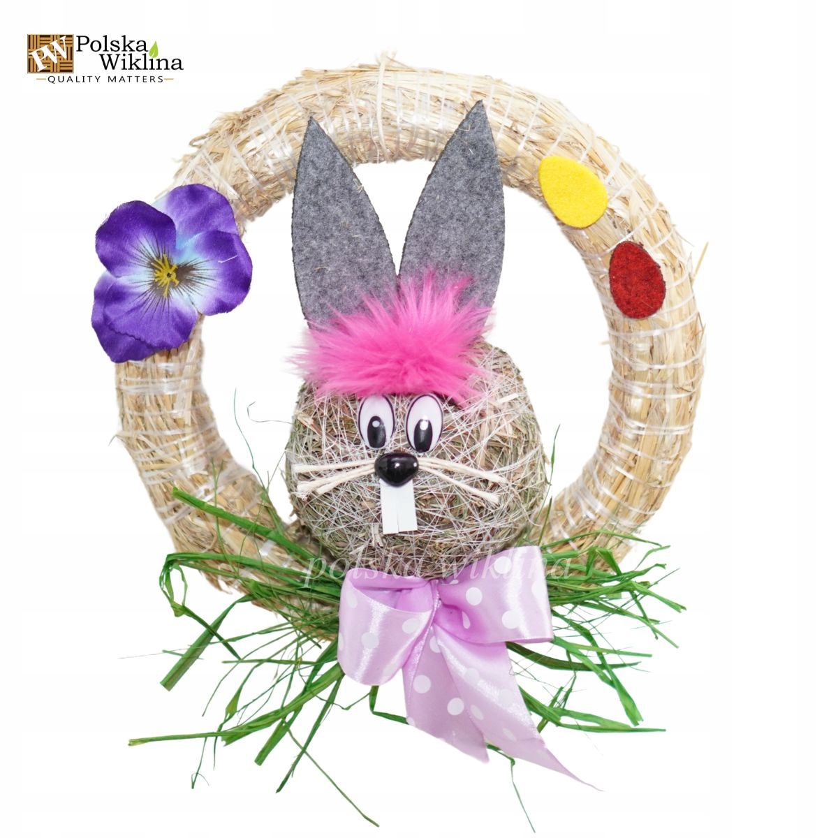 Гарний великодній віночок ручної роботи з милим зайчиком стане чудовою прикрасою для дверей, вікна чи стіни. Виготовлена з натуральних матеріалів - соломи, трави та фетру - вона додасть різдвяного шарму будь-якому інтер'єру.