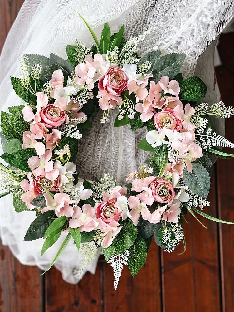 Весняний віночок, прикрашений штучними квітами рожевих і кремових відтінків і різноманітними аксесуарами, листям і бантом.