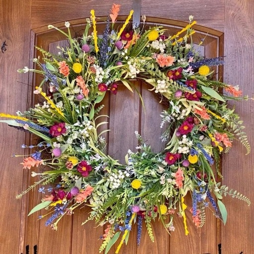 Штучний весняно-літній дверний вінок, якісно виготовлений і з яскравими кольорами, виглядає реалістично та красиво