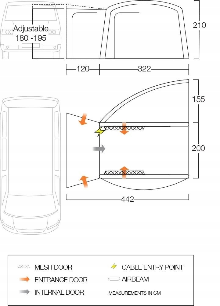 - Багатофункціональне кріплення - тамбур підходить для більшості кемперів завдяки різним методам встановлення: 6-мм кадор, ремені через дах, гачки для поручнів і рукав для оголів’я.